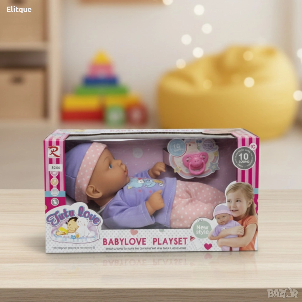 Легнало бебе с биберон и 10 звука – нежна коледна играчка за грижа и обич Babylove → Обява 52820277
