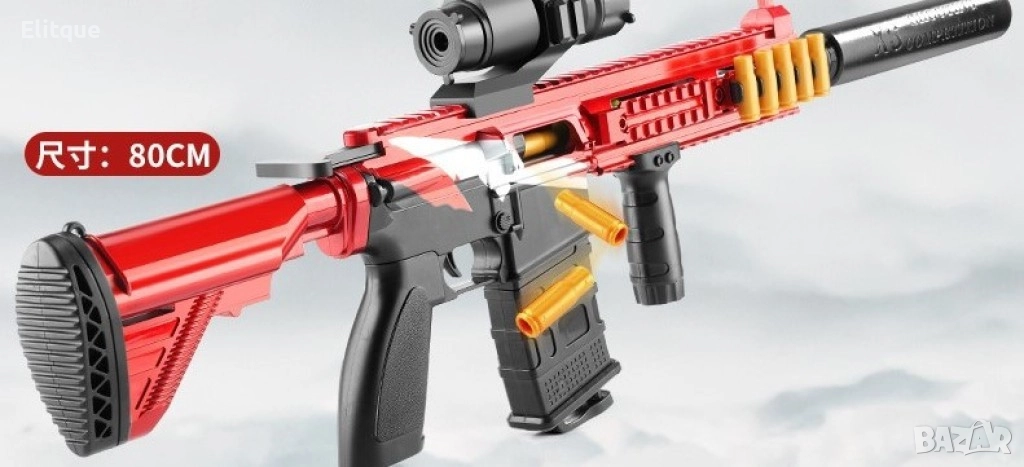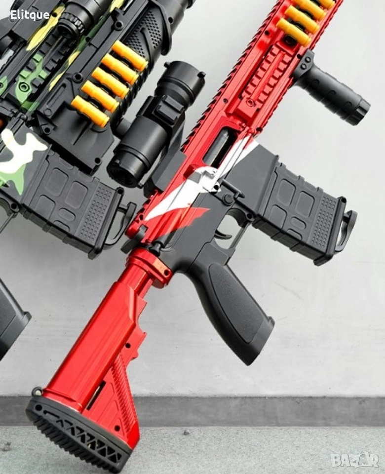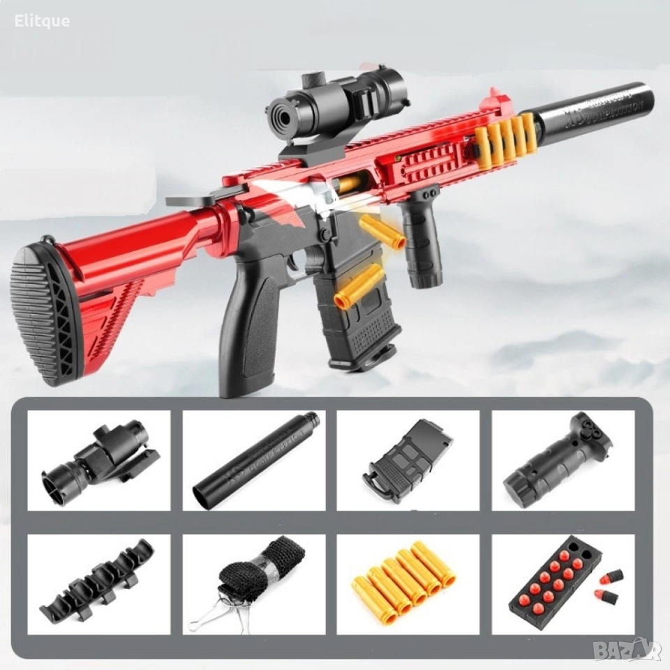 Детска играчка пушка автомат с меки патрони и допълнителни екстри / Цвят: Червен / Материал: пластмаса с високо качество, екологична и напълно безвредна за детското здраве; Супер реалистичен дизайн, с внимание към всеки дребен детайл; Дълъг и точен мерник и удобна за захват дръжкка; Реалистични размери: дължина – 80 см.; 12 меки бомбички в червен цвят; 5 меки патрона в жълт цвят; 1 брой заглушител; 1 брой