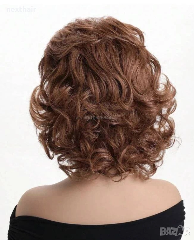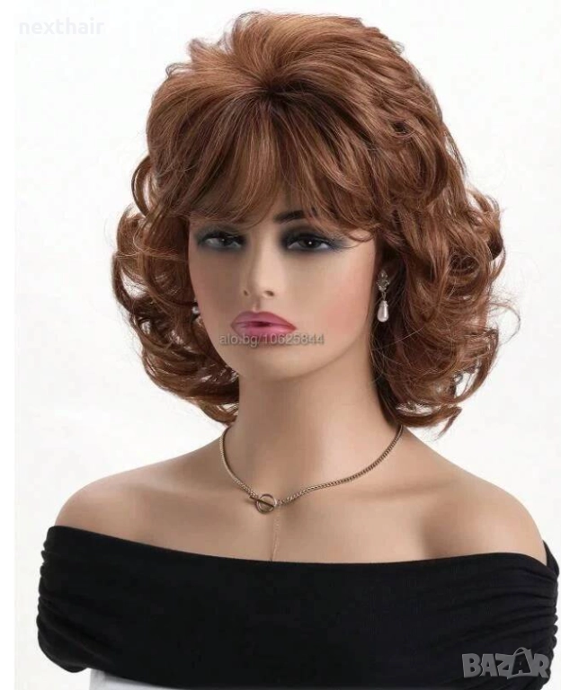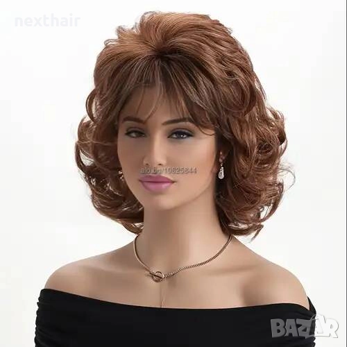 Къса дамска къдрава кафява синтетична перука с бретон → Обява 52821443