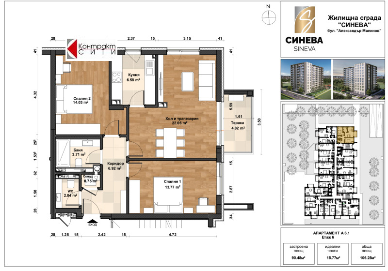 Контракт Сити ООД продава просторен тристаен апартамент с изложение изток/север на шести жилищен етаж в новострояща се сграда в Младост 4, срещу Декатлон. Очаква се Разрешение за ползване до м. декември 2026г. Сградата се изпълнява с висококачествени материали, изолация от каменна вата 12 см и окачена фасада, отопление на газ с поставено индивидуално газово котле и радиатори във всеки от апартаментие. Изпълнено окабеляване и отръбяване за климатици, висок клас апартаментна блиндирана врата и поставени интериорни врати на реномиран български производител. Шесткамерна дограма с троен стъклопакет, френски прозорци в жилищата. Жилището се състои от дневна, отделна кухня, две големи спални, един балкон, баня с тоалетна и отделна тоалетна, склад в жилището. В сутерена има избор на паркоместа. Всички налични апартаменти в сградата, както и всички актуални предложения на Контракт Сити: https://contract-city.com/bg/ и тел. 0886 600 601