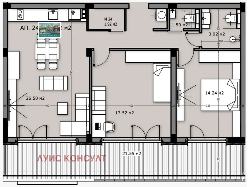 АГЕНЦИЯ ЗА НЕДВИЖИМИ ИМОТИ ,, ЛУИС КОНСУЛТ '' ПРОДАВА ДВУСТАЕН ТУХЛЕН АПАРТАМЕНТ В ЛУКСОЗНА НОВА ЖИЛИЩНА СГРАДА .