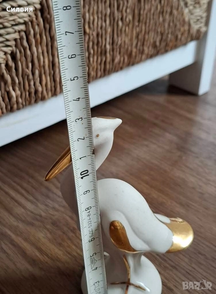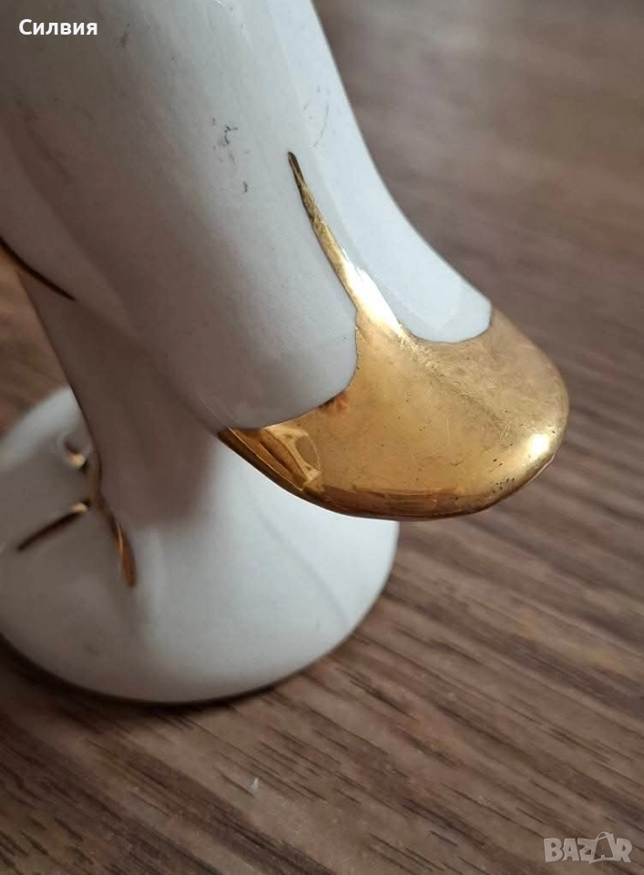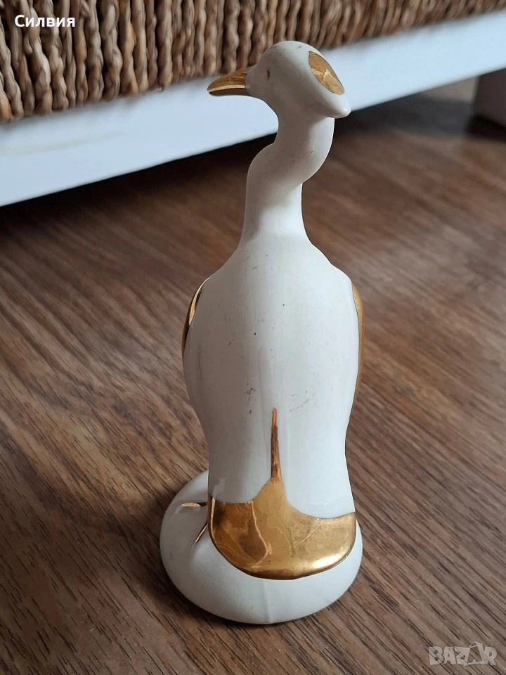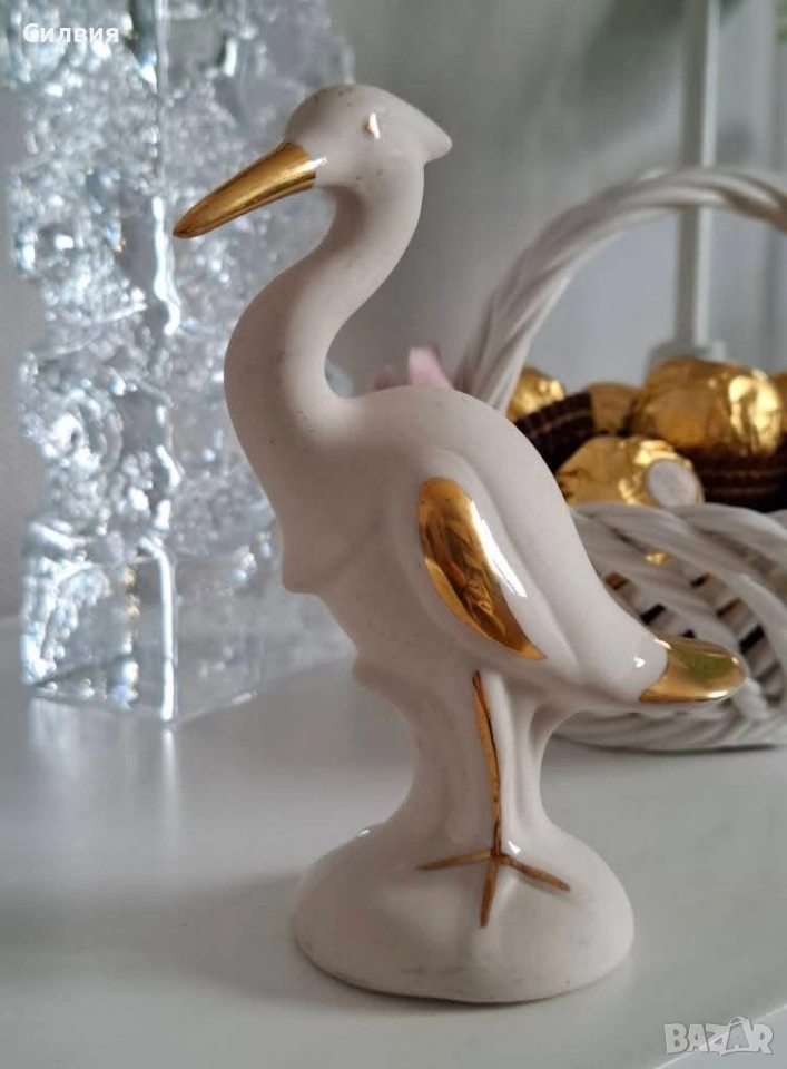 Фигурка от порцелан (biscuit) с ръчно нанесени позлатени детайли. Израз на изящество и лекота, подходяща за елегантен интериор или колекционерска витрина. Височина: около 12см. Отлично състояние. Чапла – символ на елегантност и спокойствие. Изящна порцеланова фигурка на чапла, сякаш уловила миг на безвремие. Силуетът е фин и грациозен, с деликатно извити линии, подчертани от ръчно положени позлатени акценти върху клюна, крилото, опашката и крака. Фигурката е в отлично състояние и носи усещане за лекота и хармония – идеална за стилен акцент в дома или като специален подарък за ценител на красотата. Цена 2️⃣0️⃣лв. 10,22 € ೋ🌷 ೋ🌷 ೋ🌷