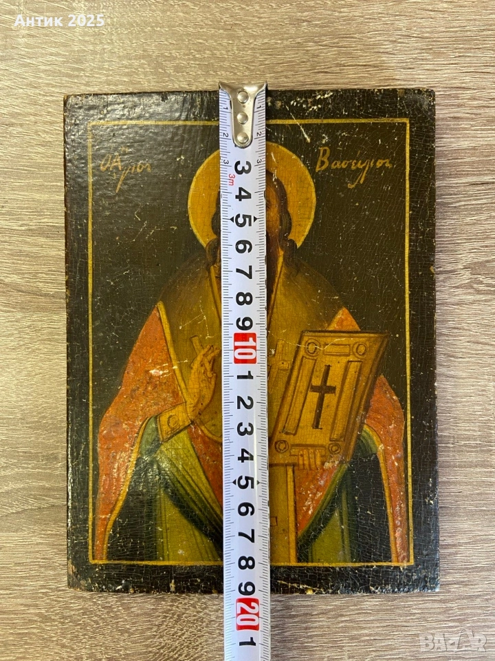 Старинна ръчно рисувана православна икона, изобразяваща Свети Василий Велики, изпълнена върху дървена дъска с традиционна техника (темпера върху грунт).