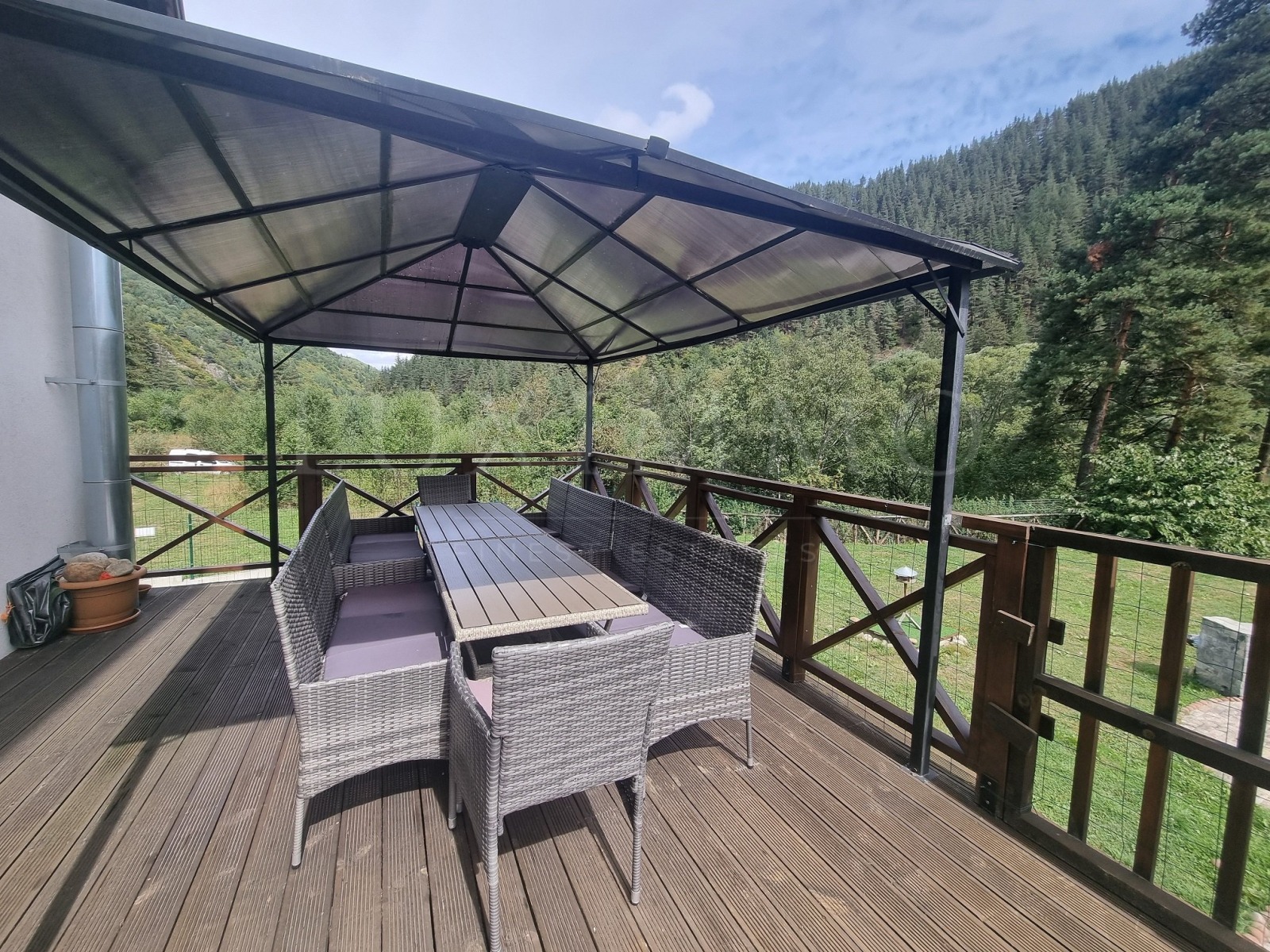 Дворът е с размер от 1200 кв.м., равен и заграден, с гледка към писта Ястребец.