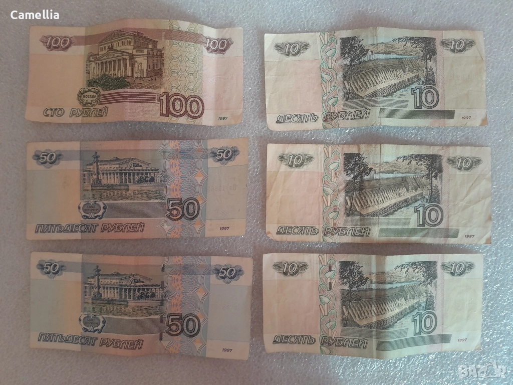 Руски стари банкноти. 10, 50, 100 рубли. В циркулация от 1997 г., но през 2004 г е модифицирана.
