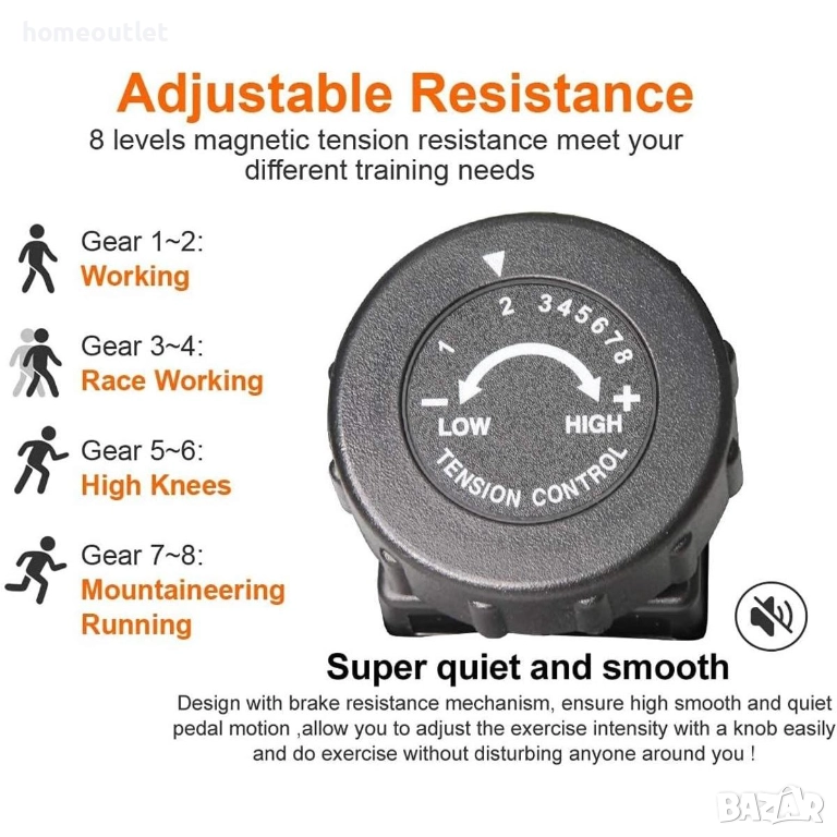 С 8 нива на магнитно съпротивление можете да регулирате интензивността според вашите нужди – от леко движение до по-интензивна тренировка.