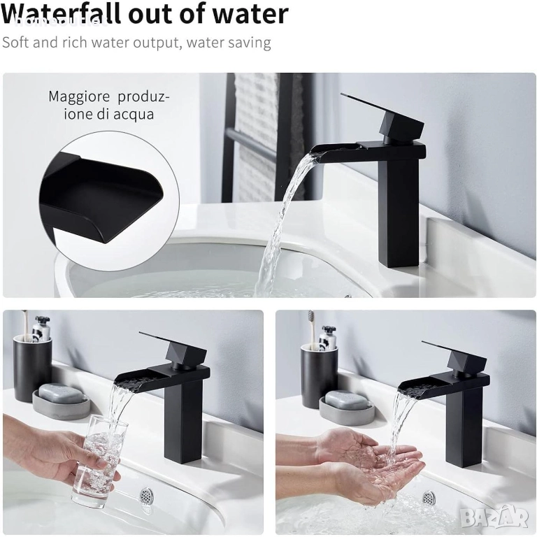 Смесителят е проектиран по принципа на водопадния поток – водата се насочва през специален канал и изтича плавно и тихо, без пръски.