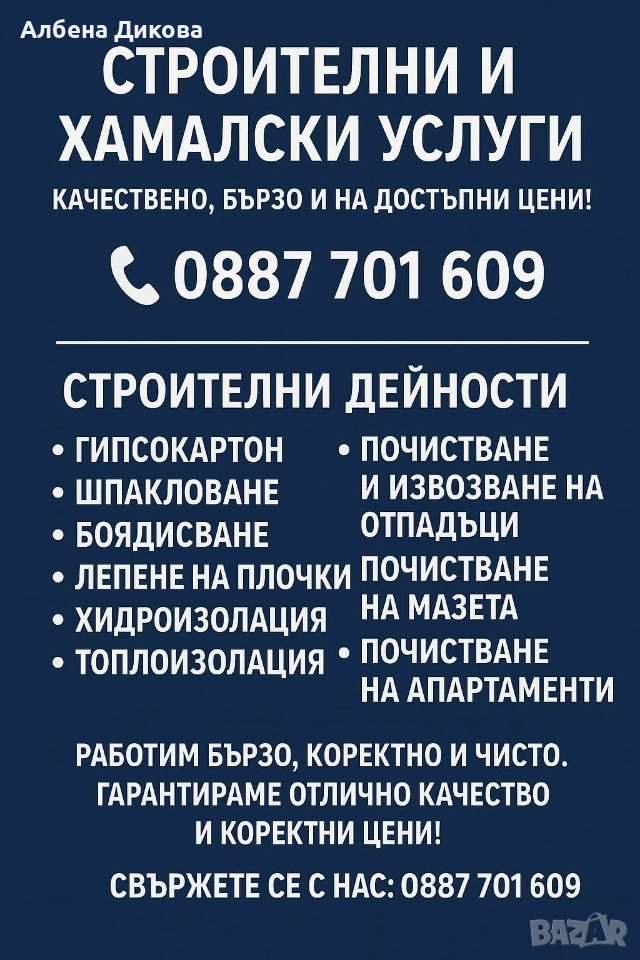 Предлагаме хамалски услуги – почистване на мазета и тавани, преместване, изхвърляне на стари вещи, ремонтни дейности и други. Работим коректно, бързо и отговорно, на достъпни цени. На разположение сме 24/7. Телефон за връзка : 0887701609