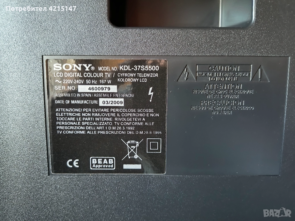 Sony Bravia KDL-37S5500 37" 1080p HD LCD-Teлeвизор+Sony Blu-ray DVD