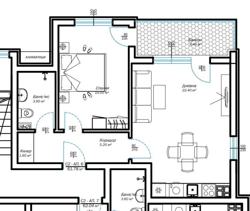 Жилището с площ 67.32 кв.м. е разположено на 2-ри етаж от общо четири, като разпределението включва коридор, килер, дневна с кухненски бокс, отделна спалня, баня с тоалетна и балкон.