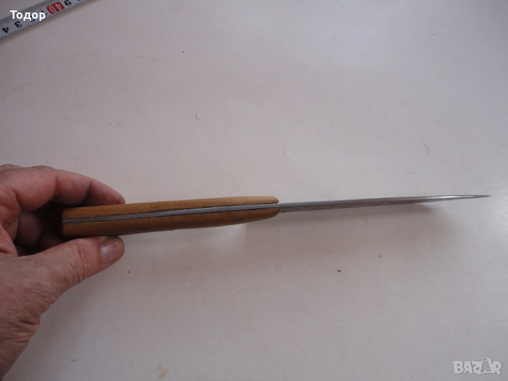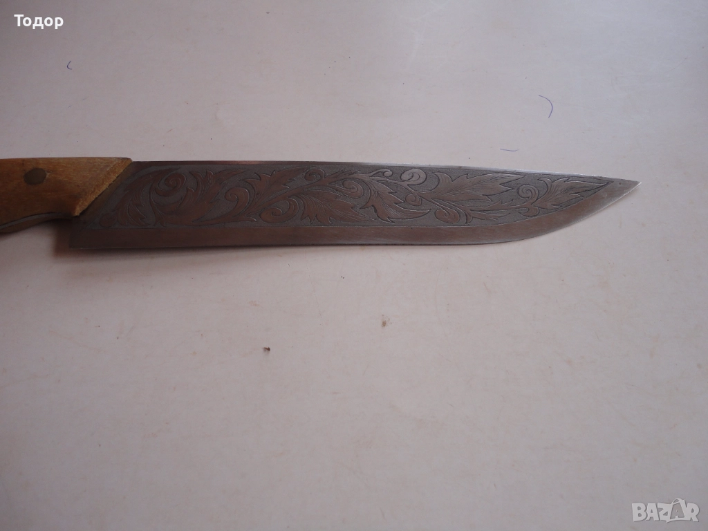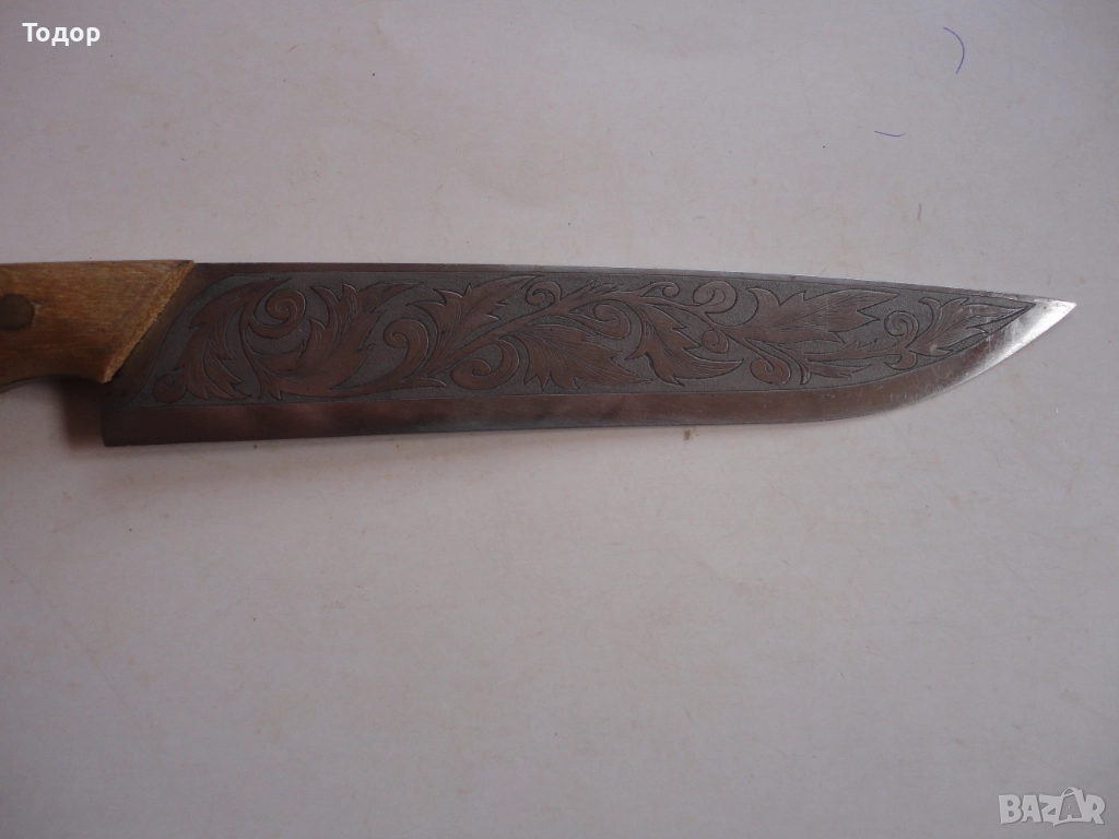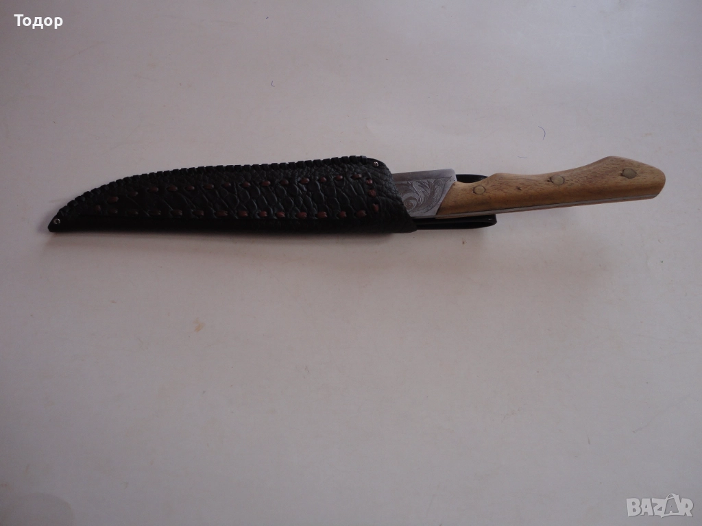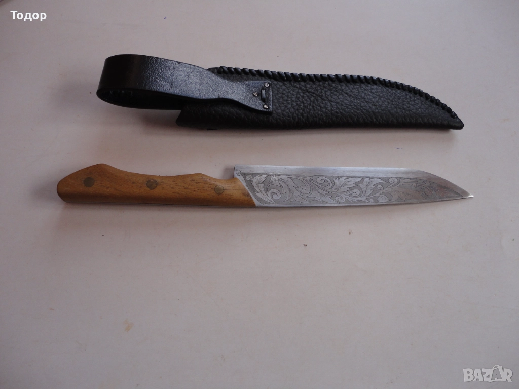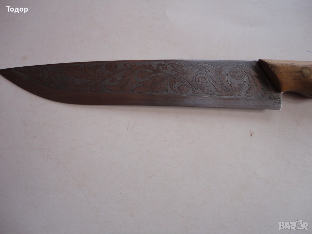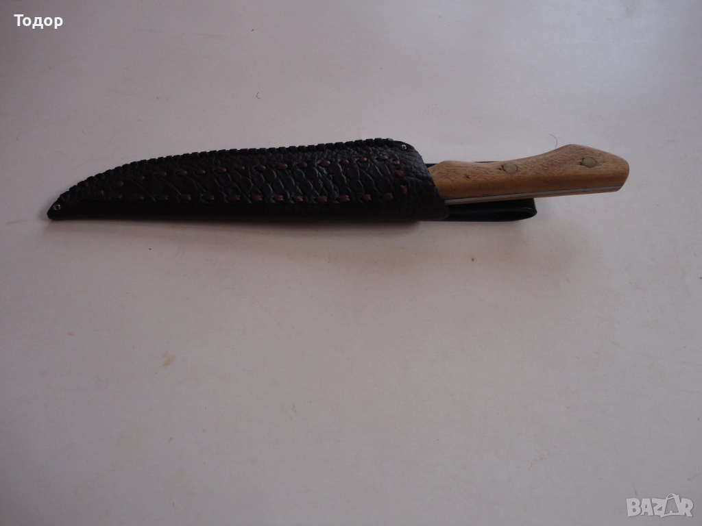 Страхотна изработка с дължина 30,5 см ширина 32 мм Деблина на стоманата 3 мм От двете страни острието е покрито с майсторски направени гравюри Чирени от чимшир с 3 бронзови нита Кожена кания от дебела естествена кожа много майсторска изработка Отлично състояние