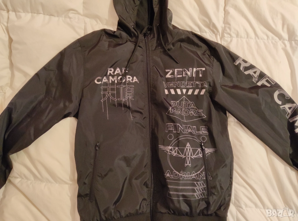 Оригинално яке на рапърa RAF CAMORA, произведено в ограничени бройки специално за издаването на албумът му, заглавията на песните са изписани на якето, дължина по ципът 65 см, ширина под мишниците 57 см, отлично състояние.