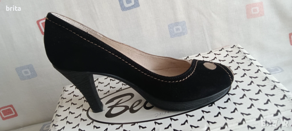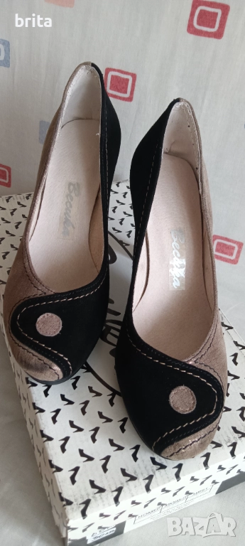 Номер 36 със стелка 22,2 см, т.е. леко умалени като 35 и 1/2 номер Изработени от естествен велур . Едната половина черно, другата бежово като бежовата страна е лазерно обработена с приятен блестящ ефект. Тока е висок 10 см, с платформа под пръсти 1,5 см. Много нежна обувка , с елегантен класически силует. По скоро за по слаб крак до нормален.