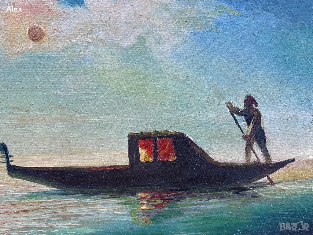 Ръчно рисувана картина с морски/речен пейзаж – лодка с фигура на гребец, мека светлина и спокойна атмосфера. Топли и студени тонове, подходяща за интериор – дом, офис, заведение или колекц