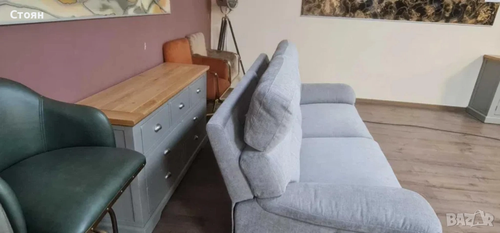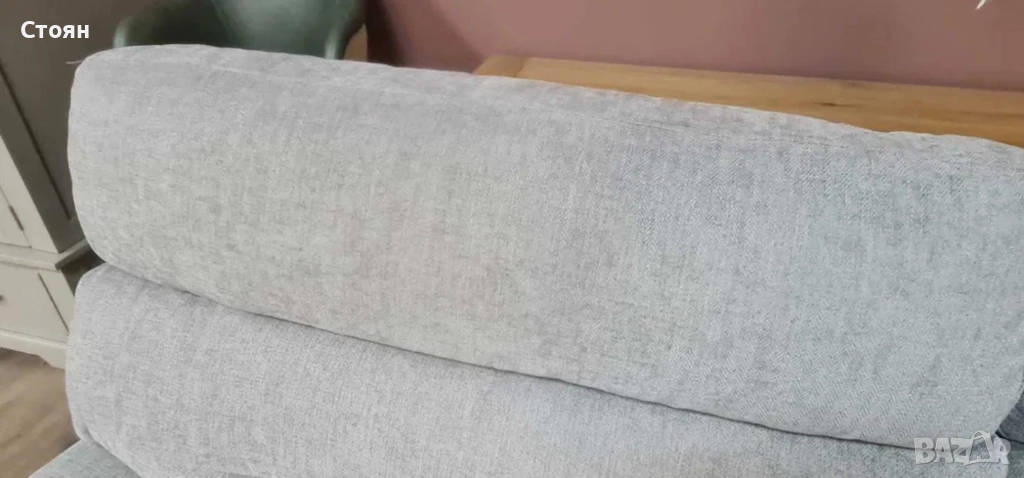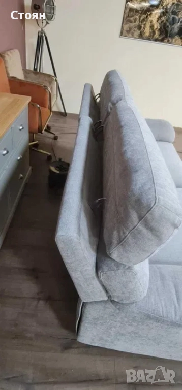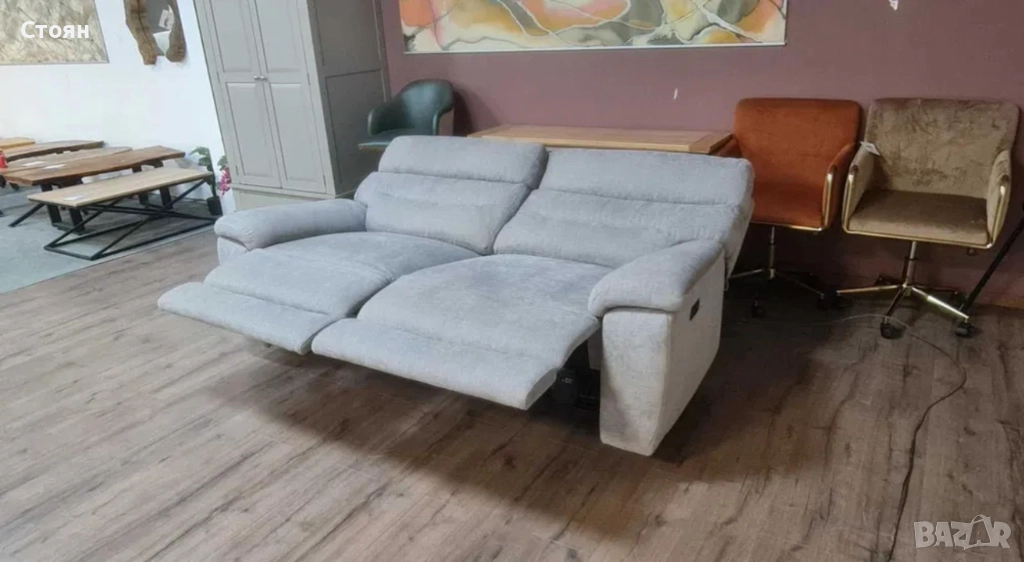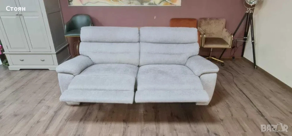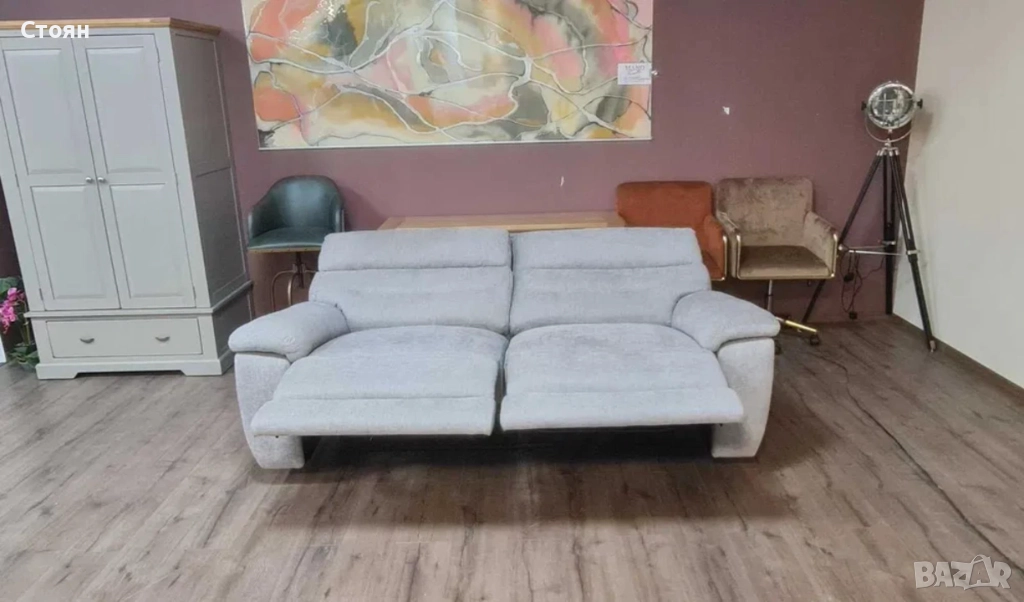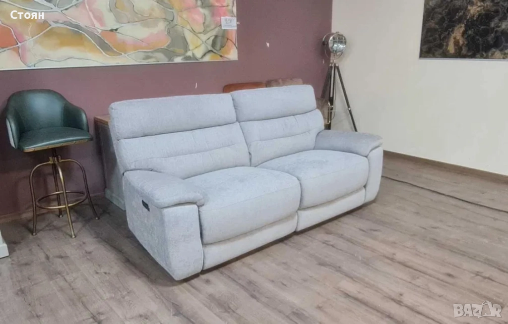 Сив диван от плат тройка с електрически релаксиращ механизъм за краката и облегалките.