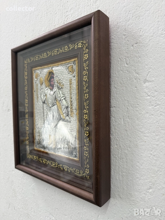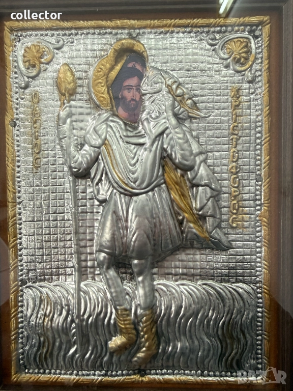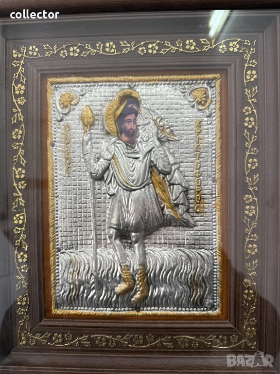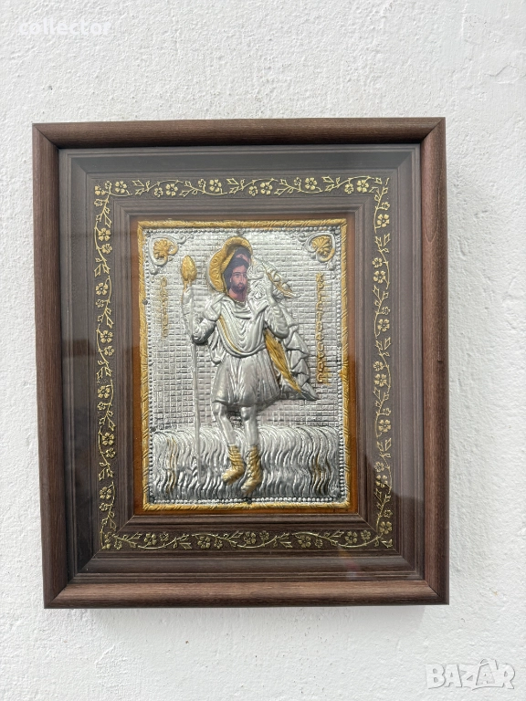 Икона на Свети Христофор, изключително почитан християнски мъченик, известен най-вече като покровител на пътуващите (шофьори, моряци, летци). Същата е ръчна изработка, посребрена и позлатена, поставена в дървена рамка зад предпазно стъкло.