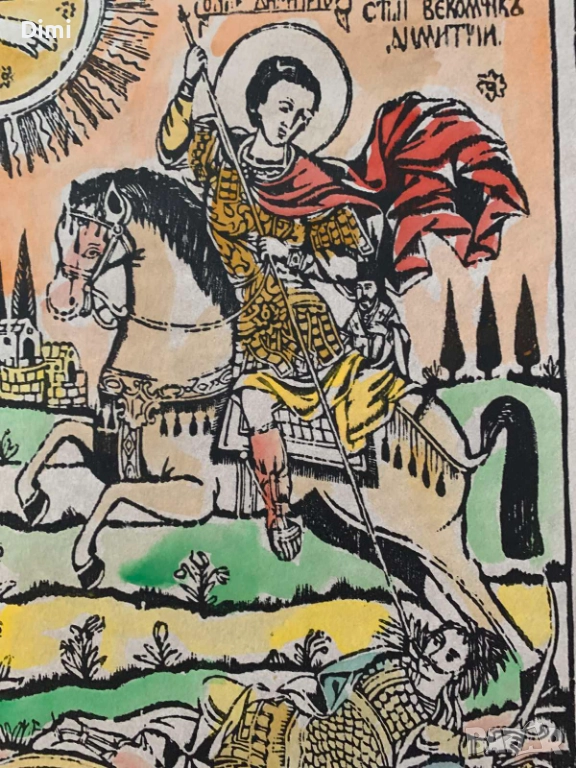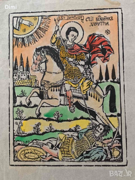 ВЪЗРОЖДЕНСКА ЩАМПА "Св. Димитър-Солунски" преди 1900 г цветна → Обява 52826862
