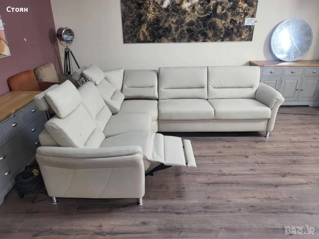 Светло кремав ъглов диван от плат Dakar с електрически релаксиращ механизъм за краката на едната крайна седалка и подвижни облегалки на ъгловата част.