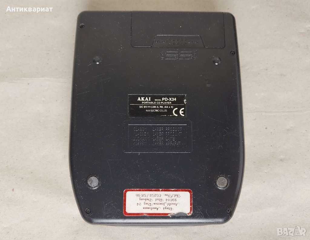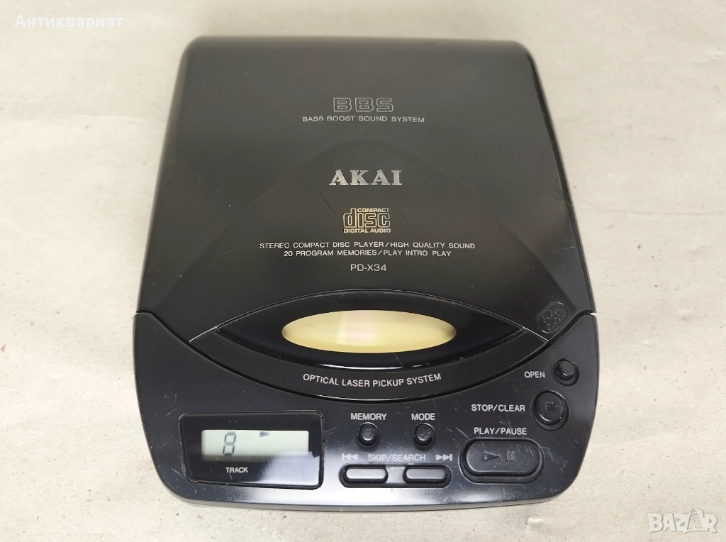 Висок клас преносим CD плеар AKAI PD-X34, работи безупречно, чете и записани дискове. Външният вид се вижда на снимките - видими следи от употреба, но без счупено или пукнато. Захранва се с 4 х АА батерии (не са включени). Изпращам по Спиди и по Еконт.