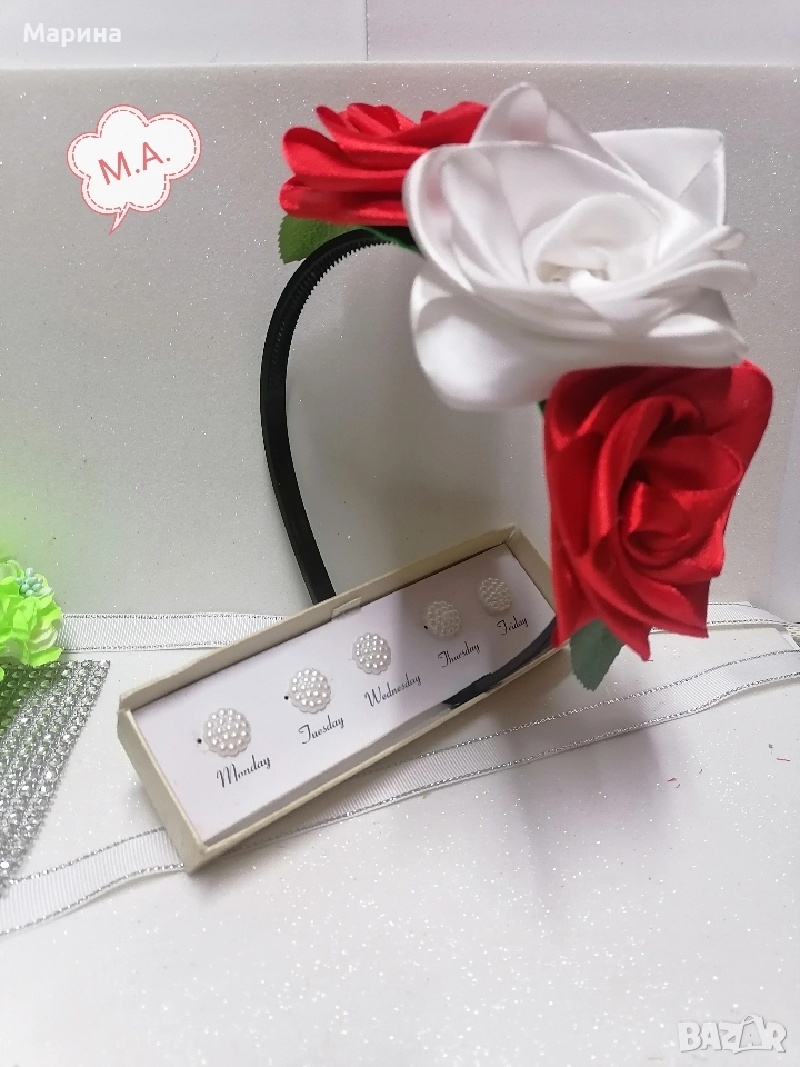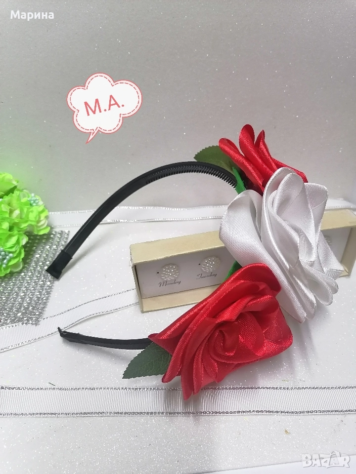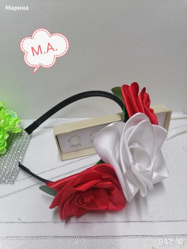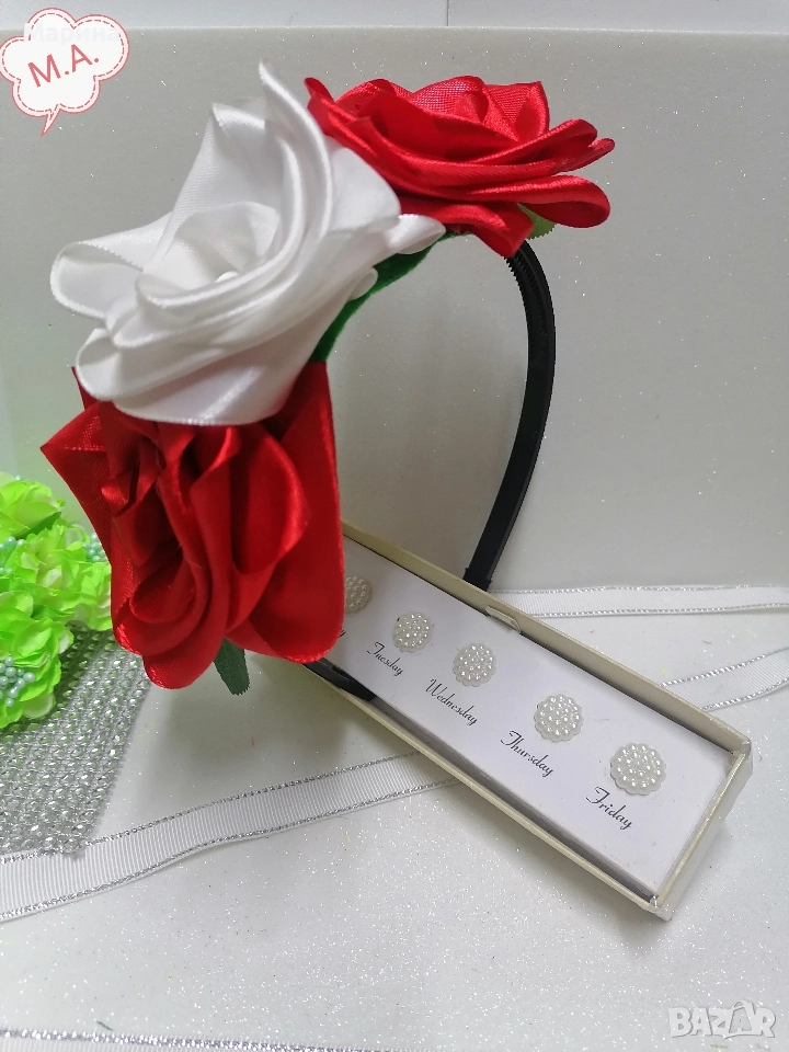 Диадема има зъбчета, удобна е за носене. Рози изработени от сатен с диаметър:7,5 - 8 см.