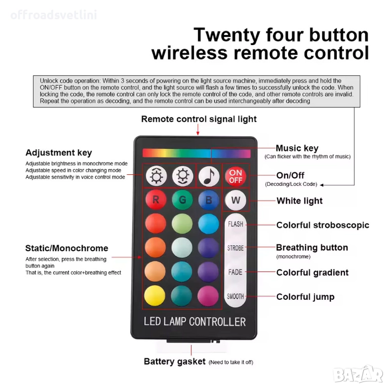 Светлинни режими: 12 статични цвята + 4 динамични режима