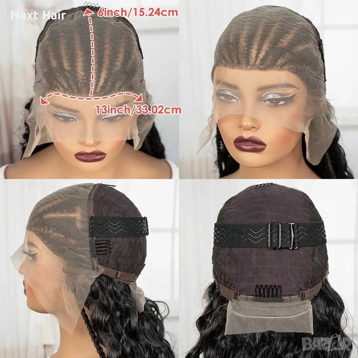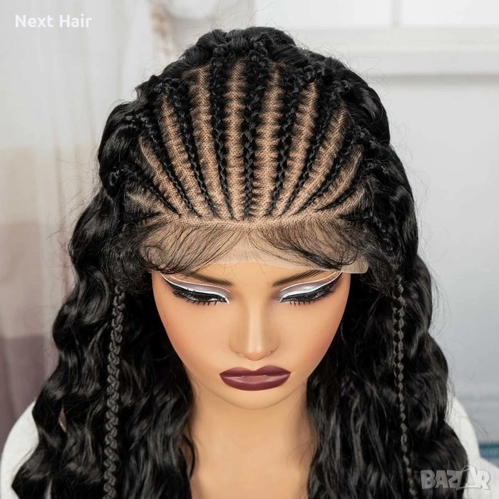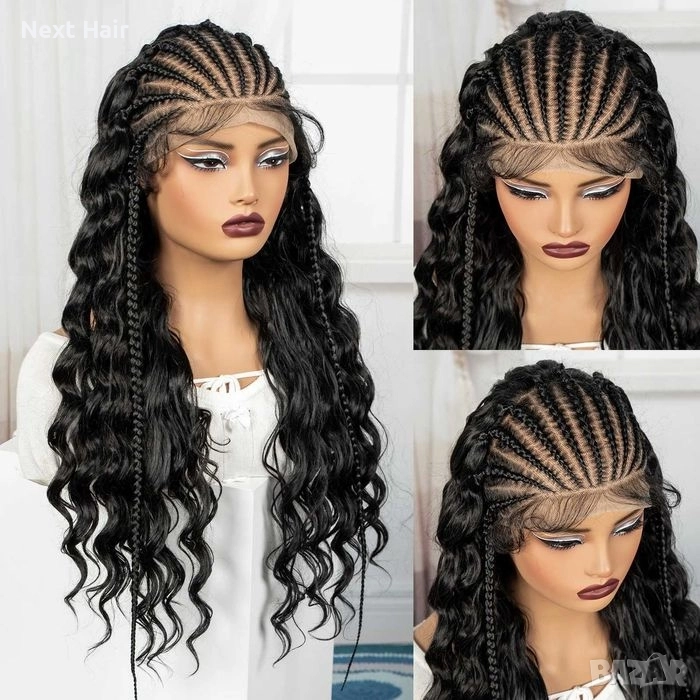Тази висококласна синтетична перука съчетава екзотичен стил и модерен дизайн. В горната част е оформена с прецизни пълзящи плитки, които преминават в ефектна, обемна къдрава дължина. Наситеният черен цвят придава дълбочина и луксозно излъчване, подходящо както за ежедневна визия, така и за специални поводи.