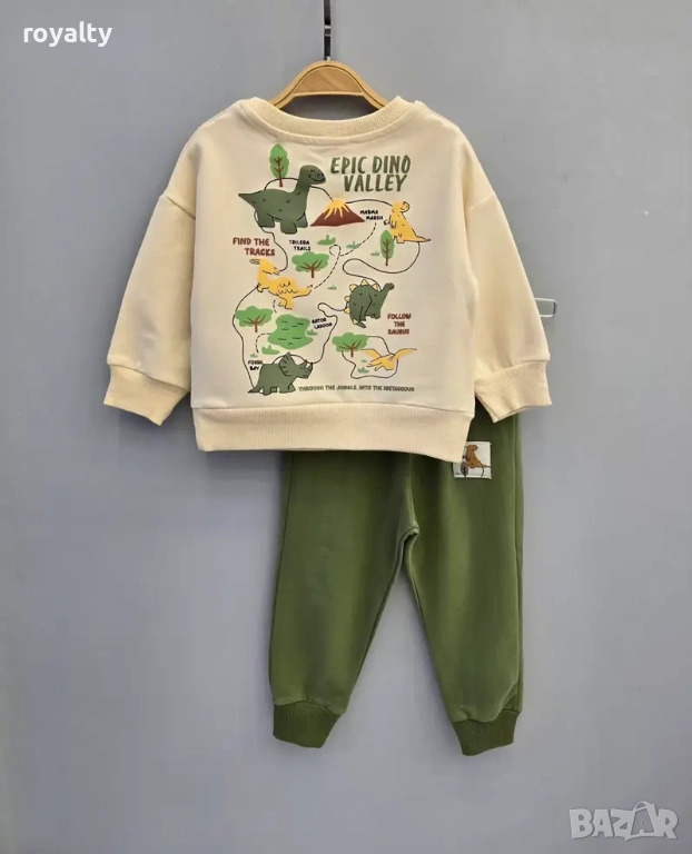 Подарете на малкия откривател комфорт и много усмивки с този очарователен детски комплект за момче, вдъхновен от света на динозаврите. Моделът съчетава кремав суитшърт с весели илюстрации и долнище в зелен и сив цвят, което завършва визията.