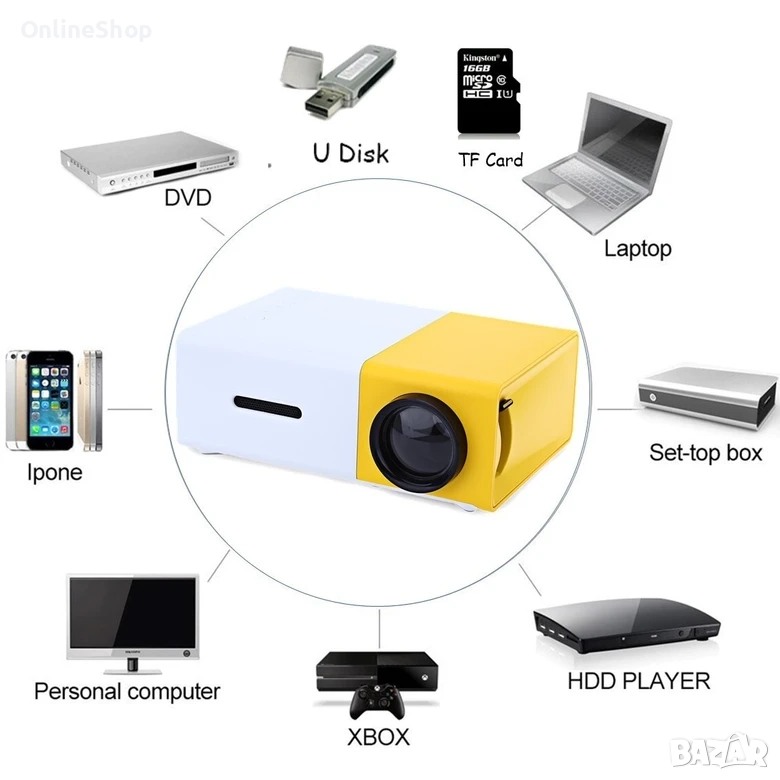 Изработен е от висококачествен пластмасов материал. Правоъгълна форма в жълт и бял цвят. Опростен дизайн с ясни и чисти цветове. LED мини проектора пристига със себе си с цяло оборудване от дистанционно управление, кабел за зареждане и отделен адаптер с 3.5мм жак кабел.