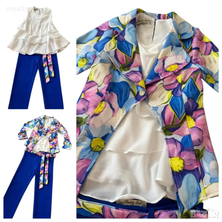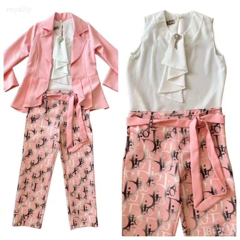 Стилен и очарователен костюм за момичета, състоящ се от сако, панталон, блуза и колан. Идеален за официални поводи, училищни тържества или специални поводи. Всеки елемент е внимателно изработен, за да осигури комфорт, удобство и перфектна визия през целия ден.