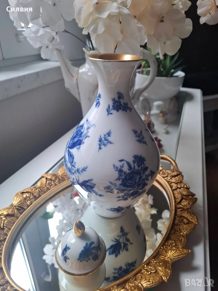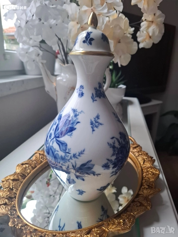 Порцеланова Ваза "Bavaria Jaeger & Co." - Синя Флорална Феерия 💙 Потопете се в класическия чар с тази изящна порцеланова ваза, произведена от Jaeger & Co. в Бавария, Германия. Тя е перфектното допълнение към всеки дом, внасяйки нотка лукс и антична елегантност. Jaeger & Co., Bavaria, Germany (Маркировка PMR - Porzellanmanufaktur Reichenbach) Висококачествен бял порцелан. Класическа форма с разширяващо се гърло, подчертана с широк златен кант. Кобалтово синя флорална декорация с мотиви на стилизирани цветя (наподобяващи лалета и диви цветя) и нежни клонки. Контрастът между искрящо белия порцелан и наситеното синьо създава завладяващ визуален ефект. Състояние: Отлично запазена. Не пропускайте шанса да притежавате този великолепен елемент от баварската порцеланова традиция! Идеална за любителите на винтидж стила или като очарователна самостоятелна мебел в класически интериор. Височина: 22,5 см, с капак-26см. диаметър: около 13 см. ✽✧✽•°”˜🦋”°•✽✧✽•°”˜🦋”°•✽✧✽•°”˜🦋”°•✽✧✽•°”🦋˜”°•✽✧✽•