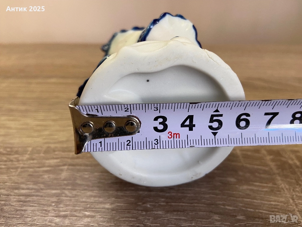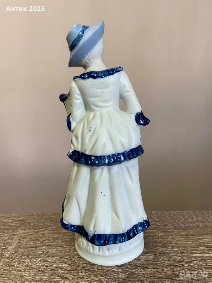 Елегантна винтидж порцеланова статуетка в класическа бяло-синя цветова гама. Фигурката изобразява дама в рокля с декоративна украса, с шапка и лира в ръце. Фината декорация, внимателната изработка на детайлите и плавните линии придават на изделието изискан и романтичен характер.