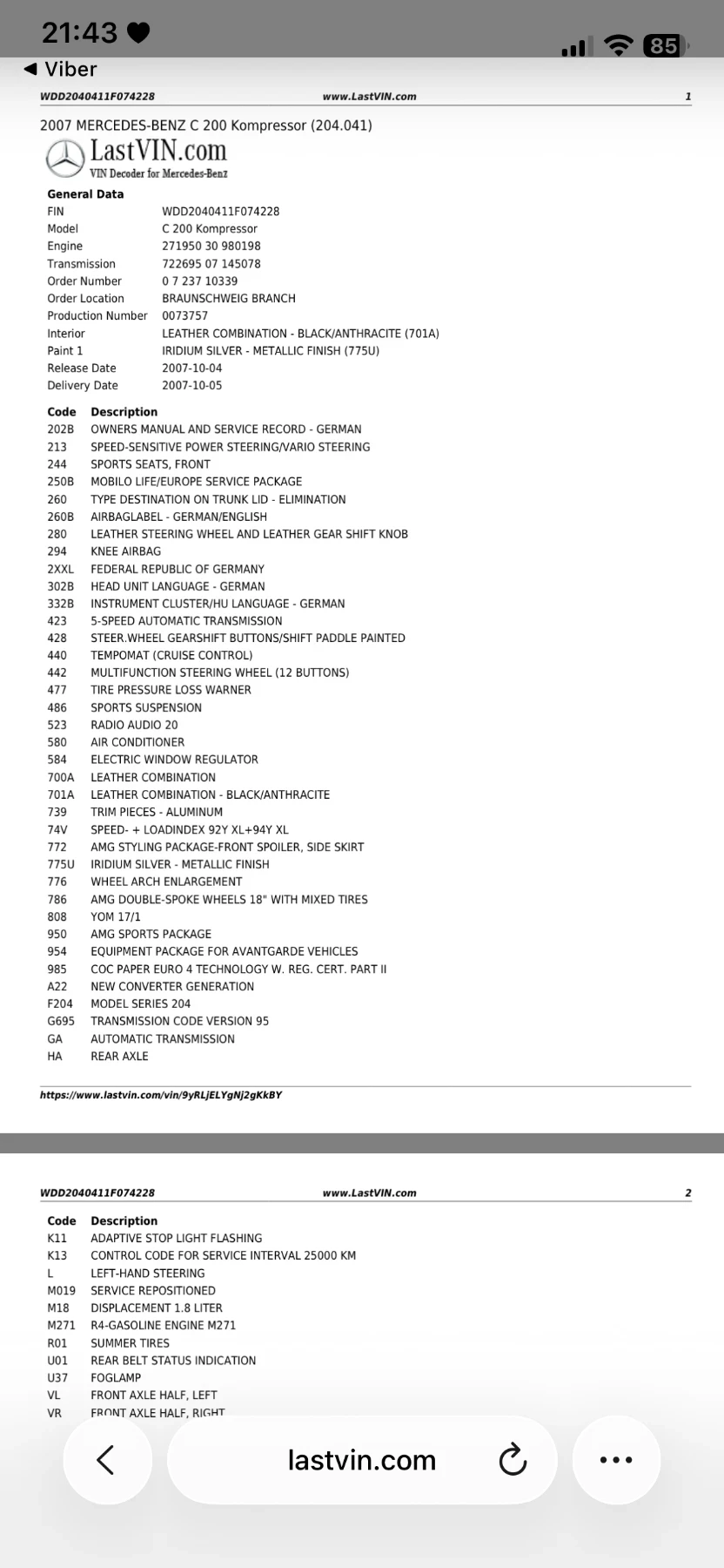 1. История и техническо състояние: - Автомобилът е закупен от официално представителство на Mercedes в Германия през септември 2024 г. на реални 182 000 км на спечелен търг от 7cars ! С оригинален АМГ пакет, без никакви удари и интервенции, цветът по рама е Iridium Silver и е по-добрия двигател 200Kompessor (М271), който към момента е само на бензин ! ! Възможен е монтаж на газова уредба и е подходящо за двигателя . Сменен ангренажен комплект Ivis (верига + вариатори, банани и др. с гаранция) - Продава се поради преминаване към SUV (Volvo) - Предлага се с всички документи по придобиването, включително DEKRA преглед, фактури за обслужвания и гуми, сервизни данни и видео от пристигането и - Пълна сервизна история, с водена книжка, обслужване на всеки 10-12 хил. км - Възможен преглед в сервиз по Ваш избор - Последни обслужвания: Масло на двигател (5W40 MB 229. 5) на 199 хил. км и масло на автоматична скоростна кутия на 183 хил. км. - успешно извършен ГТП на 17. 09. 2025 с отлични стойности на вредни емисии 2. Оборудване и екстри: - AMG пакет (предна броня, прагове, заден дифузьор, спорт пакет джанти) - Вентилирани спортни дискове с перфорация /оригинални/ LED дневни светлини (монтирани в Германия) - Отлично запазен интериор без следи от употреба, трилъчев волан с пера за смяна на предавките. - Оригинални алуминиеви джанти 18 инчови, с чисто нови летни гуми спорт пакет 225/40/ZR18 предни и 255/35/ZR18 задни Continental SportContact DOT 2024 3. Други удобства: - Двузонов климатроник - 5G-tronic автомат с 3 режима на шофиране Sport/Comfort/Manual - Темпомат (автопилот) - Електрически огледала и стъкла - Полукожен салон (шофьорската седалка има оригинален пожарогасител) - оригинални стелки АМГ (допълнително закупени) - Централно заключване с два ключа - тонирани стъкла със защита - индикация за налягане в гумите 4. Заключение: - Автомобил за ценители! Всичко е в напълно оригинален вид. - Изключително динамичен , надежден и запазен W204 Kompressor, без забележки по двигател, скорости и ходова част. Пристигна от Германия като до последно е обслужвана там в оторизиран сервиз - сменена спирачна течност и масло , нови накладки (предни и задни), летни гуми и други. Поддържа ли се един автомобил се гарантира неговата надеждност и стойност ! Среден разход около 8. 5-9. 5л и се зарежда премиум гориво! Основно градско се използва и км се променят, добър клиренс, перфектна устойчивост и пътно поведение. Заслужава да се види, заповядайте ! За повече информация, оглед и тест се свържете. Възможен коментар