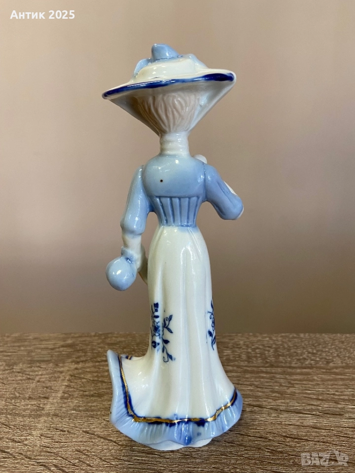 порцеланова статуетка, изобразяваща изискана дама в светла рокля със сини акценти и широка шапка. Фината ръчна декорация, класическата синьо-бяла цветова гама с кобалтови флорални мотиви и позлатени детайли придават на фигурката изтънчен и благороден вид.
