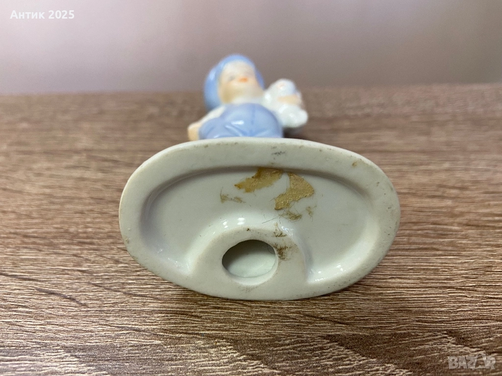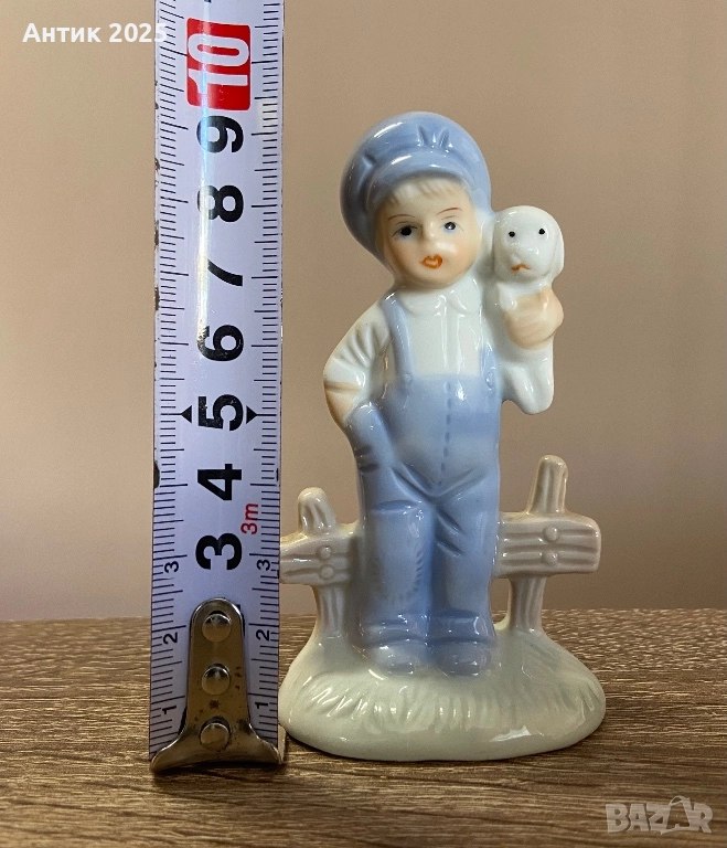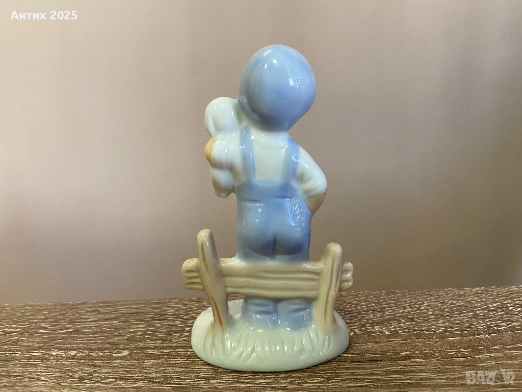 Очарователна винтидж порцеланова фигурка с трогателен сюжет — момче в син костюм, което държи агънце. Мека пастелна цветова гама, прецизно изрисувано лице и очи, гланцирана глазура. Фигурката е поставена върху декоративна основа с елементи на ограда, които придават завършен и уютен характер на композицията.