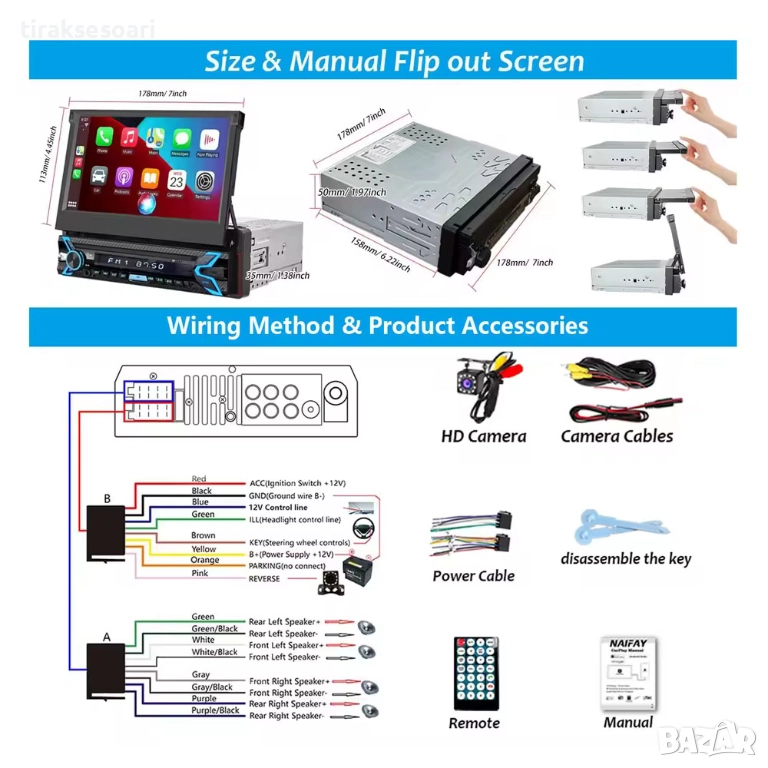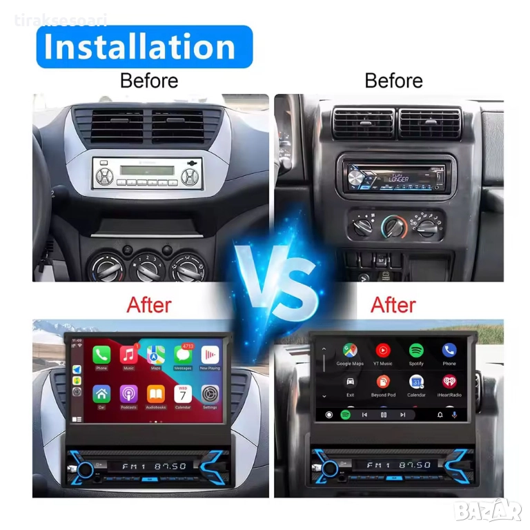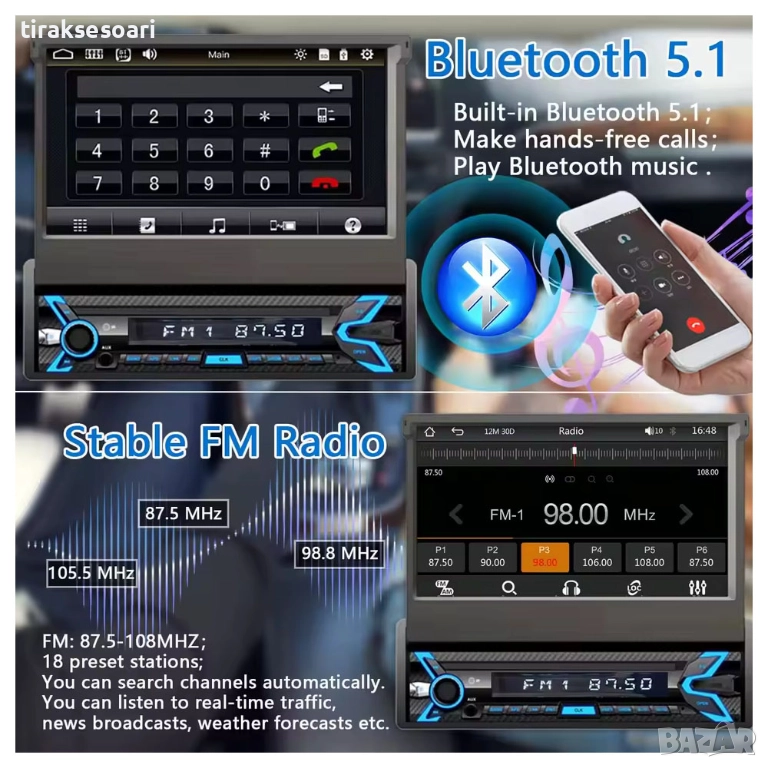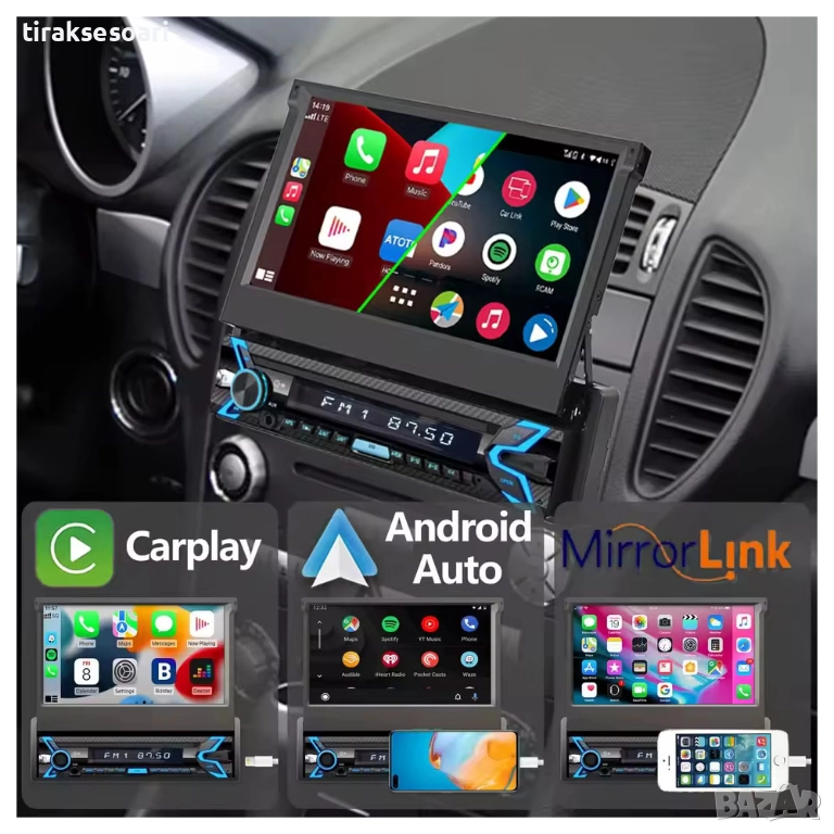 1 din android мултимедия, 7 инча изскачащ екран, carplay android auto, автомобилна навигация android 15, мултимедия с камера заден ход, bluetooth авто радио, flip out car stereo