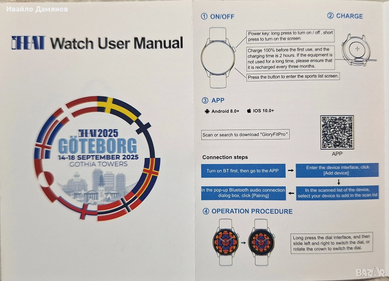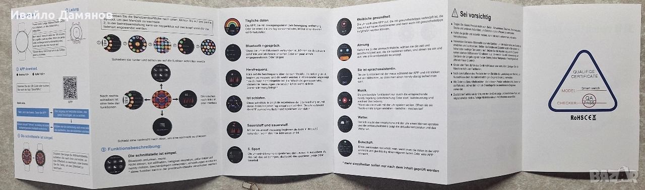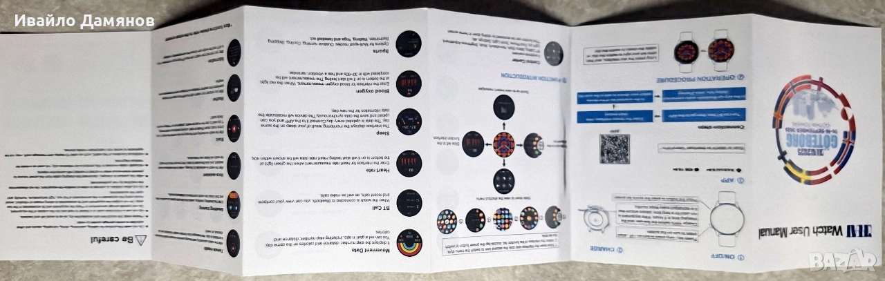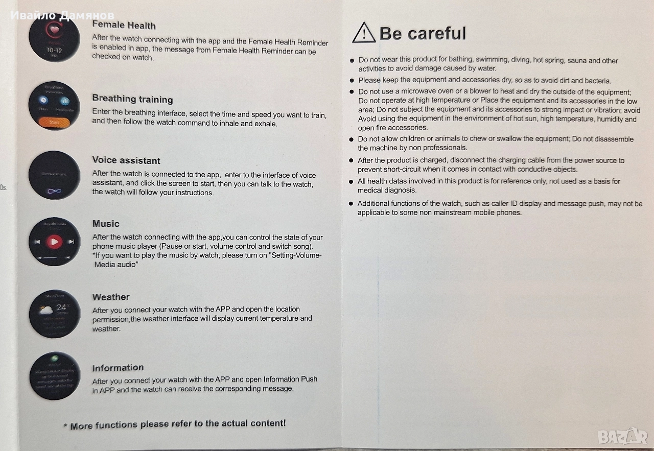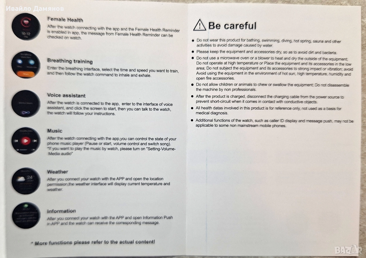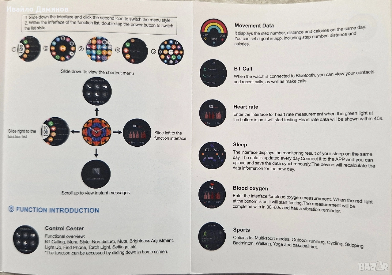 Smart часовник - чисто нов Функции за здраве: Включват измерване на сърдечен ритъм, кислород в кръвта, данни за движение и проследяване на съня. Свързаност: Поддържа Bluetooth разговори и синхронизиране на данни с приложение за телефон. Навигация: Менюто се управлява чрез плъзгане наляво/надясно и нагоре/надолу, с опции за различни стилове на изглед. Спортни режими: Предлага множество спортни режими като бягане, колоездене, йога и други. Първоначална употреба и зареждане: Заредете часовника до 100% преди първата употреба; времето за зареждане е 2 часа. При продължително неизползване презареждайте на всеки три месеца. Свързване с приложение: Необходимо е да изтеглите приложение "GloryFitPro" (съвместимо с Android 8.0+ и iOS 10.0+). Свързването изисква първо включване на Bluetooth, след което добавяне на устройството през интерфейса на приложението. Основни операции: Включването/изключването става чрез продължително натискане на бутона за захранване, а краткото натискане включва екрана. Смяна на циферблата: Можете да сменяте изгледа на циферблата чрез продължително натискане и плъзгане наляво/надясно или чрез завъртане на коронката. Не носете този продукт за къпане, плуване, гмуркане, горещ извор, сауна и други дейности, за да избегнете повреда, причинена от вода. Моля, дръжте оборудването и аксесоарите сухи, за да избегнете мръсотия и бактерии. Не използвайте микровълнова фурна или вентилатор за нагряване и изсушаване на външната страна на оборудването; Не работете при висока температура или поставяйте оборудването и неговите аксесоари в ниска зона; Не подлагайте оборудването и неговите аксесоари на силен удар или вибрации; избягвайте използването на оборудването в среда с горещо слънце, висока температура, влажност и открит огън. Не позволявайте на деца или животни да дъвчат или поглъщат оборудването; Не разглобявайте машината от непрофесионалисти. След като продуктът е зареден, изключете кабела за зареждане от източника на захранване, за да предотвратите късо съединение, когато влезе в контакт с проводими предмети. Всички здравни данни, включени в този продукт, са само за справка, а не като основа за медицинска диагноза. Допълнителни функции на часовника, като показване на идентификация на обаждащия се и изпращане на съобщения, може да не са приложими за някои нестандартни мобилни телефони.