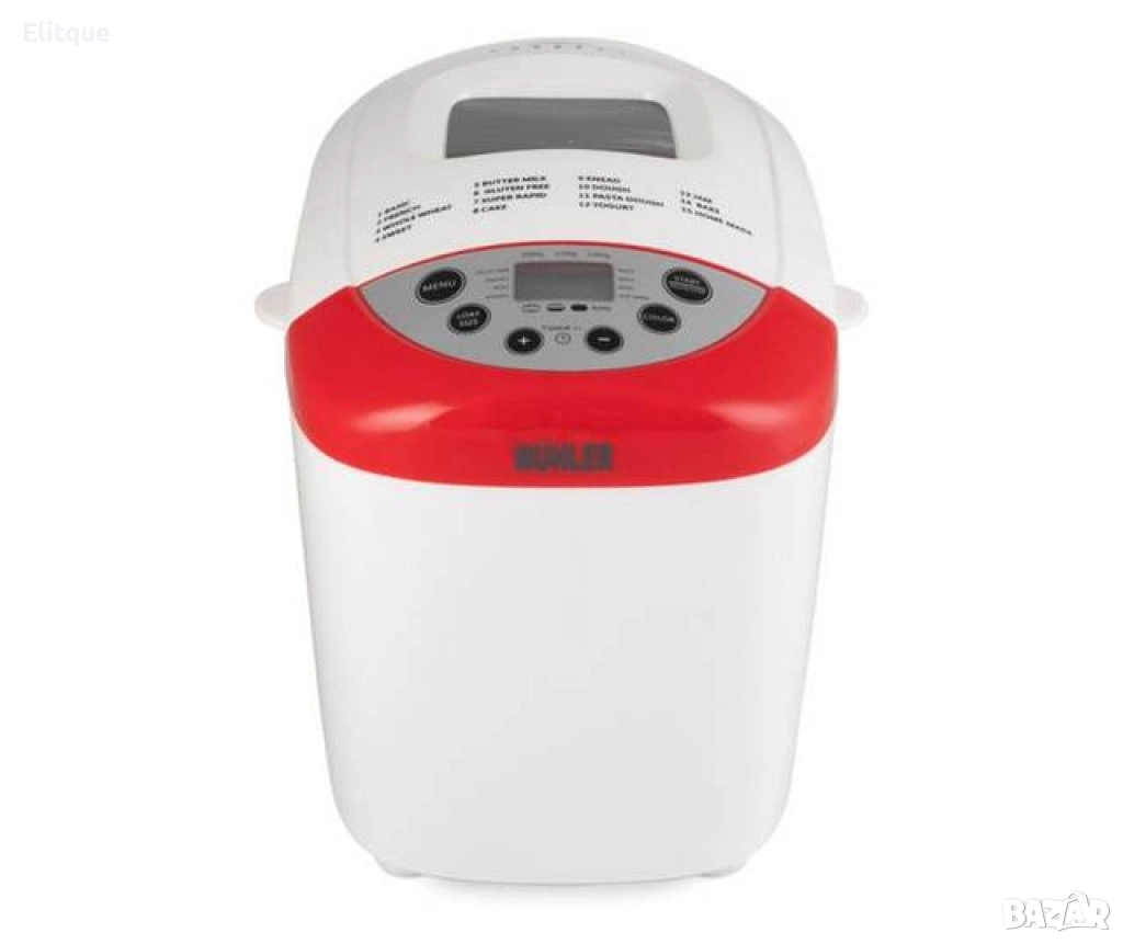 Хлебопекарната е идеален избор за всеки, който иска да се наслаждава на прясно приготвен хляб у дома. Благодарение на своите разнообразни функции и елегантен дизайн, тази хлебопекарна е практичен и стилен помощник във всяка кухня. Хлебопекарна MBM-1502, бял- червен, две бъркалки,650585 Размера на хляба 1000 г/1250 г/1500 г Топло изолиран корпус. LCD дисплей. 15 програми основна, френски хляб, пълнозърнест, сладък, млечно- маслен хляб, безглутенов, бърза, кекс, бъркане, замесване на тесто, тесто за паста, йогурт, мармалад, печене, домашен хляб (ръчна настройка). 2 бъркалки за по-голяма ефективност на месенето. Съд за печене и бъркалки с не залепващо покритие.