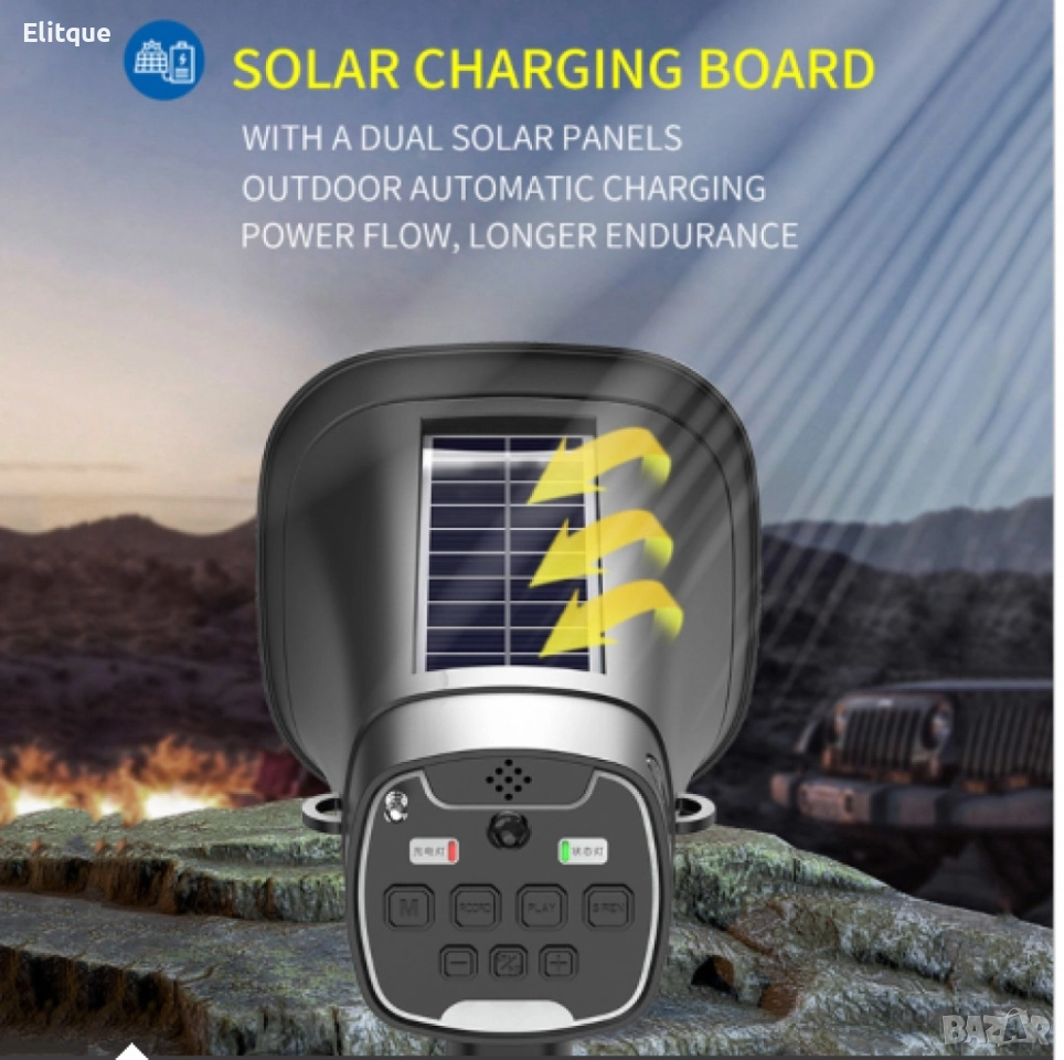 Соларно захранване: Има вградени соларни панели, които позволяват зареждане на батерията от слънчева светлина, правейки го изключително удобен за дълги излети на открито.