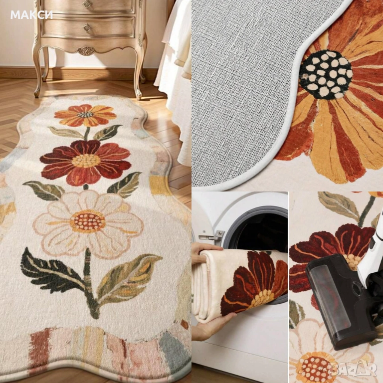 Прекрасен модерен лек и много мек килим с красиви акварелни цветя, не плъзгаща се основа, сгъващ се,