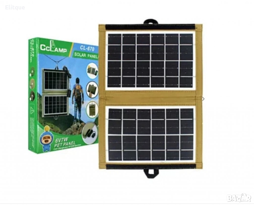 Тип продукт : Соларен панел; Преносимият соларен панел CCLAMP CL-670 е компактен и сгъваем, идеален за зареждане на USB устройства като телефони и таблети на открито. Той разполага с мощност от 7.2W и USB изход за лесно зареждане. Панелът е лек и удобен за носене, благодарение на сгъваемия дизайн, което го прави подходящ за къмпинг, туризъм и пътувания. Изработен е от висококачествени материали, които осигуряват устойчивост на атмосферни условия, и е лесен за настройка и употреба; Гаранция 12 месеца.