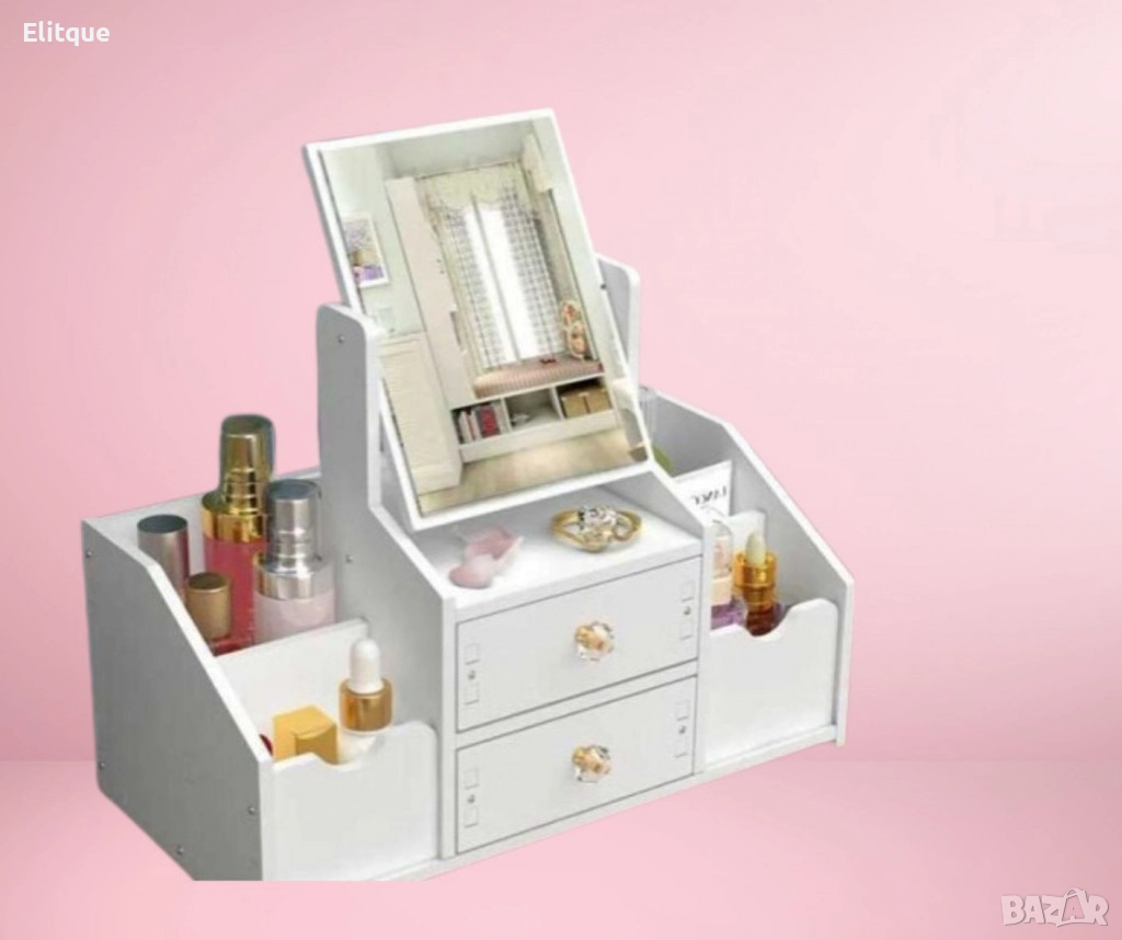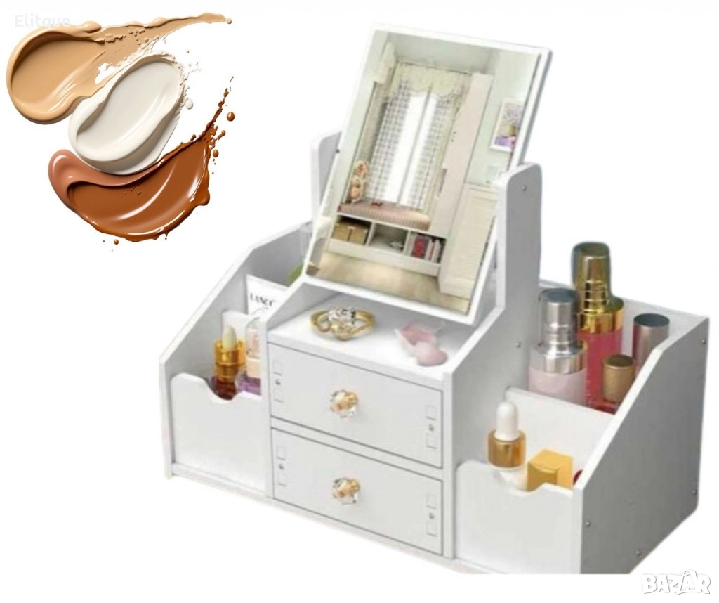 Тип продукт : Органайзер за козметика; Лазарно изрязан и изработен от здрав ПВЦ; Две чекмеджета и отделения за различни видове козметика и аксесоари; Подвижно огледало с размери 16 х 24 см; Размери: 40 х 36 х 20 см; Необходимо е самостоятелно сглобяване; С този модерен и функционален органайзер ще имате всичко необходимо на едно място, където да намерите лесно и бързо вашите любими козметични продукти. Преобразете вашата грим рутина с удобство и стил.