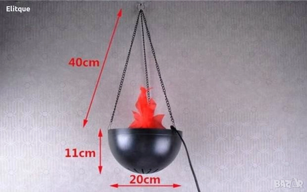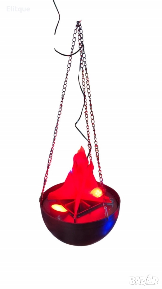 Материал: Метал и пластмаса; Размери: Ø 30 см (диаметър на съда); Захранване: Електричество (220V); Светлинен ефект: LED пламък в червено и жълто; Монтаж: Окачена конструкция с вериги; Консумация: Ниска енергийна ефективност; Безопасност: Не генерира топлина, безопасна за деца и домашни любимци; Гаранция: 12 месеца.