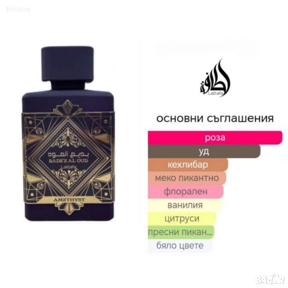 Lattafa Badee Al Oud For Glory EDP 100 ml У н и в е р с а л е н Тип: Парфюмна Вода Вид аромат: Дървесни, Ориенталски Връхни нотки: лавандула, шафран, Индийско орехче Средни Нотки: пачули, дим от агарово дърво Базови Нотки: пачули, мускус, агарово дърво