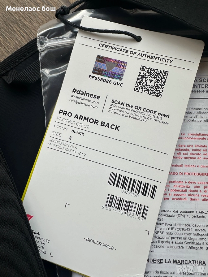 Продавам оригинален гръбен протектор DAINESE Pro Armor Back G2, чисто нов, с етикети и сертификат за автентичност.