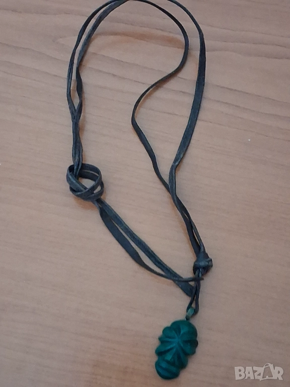 Дамско колие - кожена каишка и фигура малахит → Обява 52834584