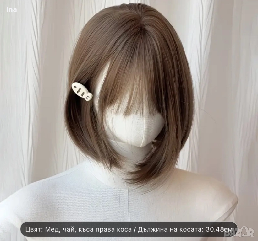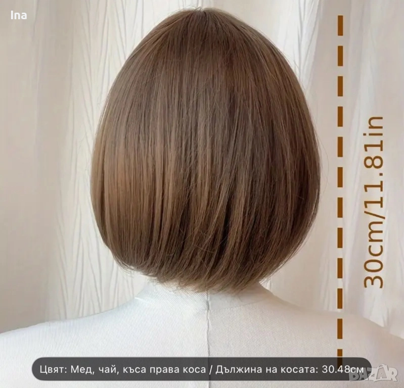 12-инчова дамска перука с бретон в цвят меден чай, къса права коса, стилна и елегантна, идеална за ежедневно носене и универсална за всички фигури.30 см дължина