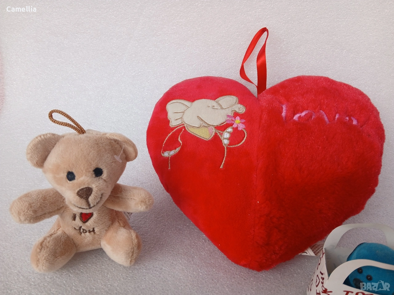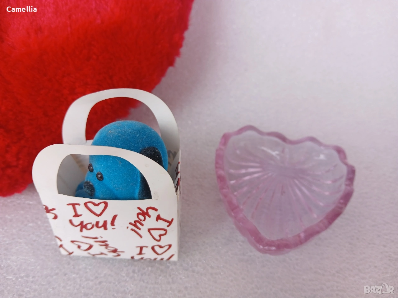 Лот от романтични подаръци за влюбени: Плюшено мече, Плюшено сърце - при натискане изговаря "Обичам те", кученце в опаковка, малка стъклена купичка, във формата на сърце.