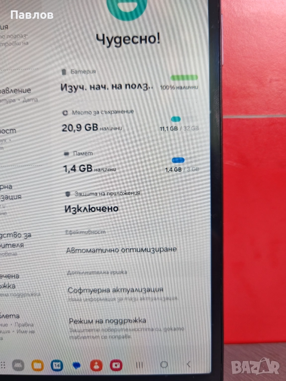 Продава се Samsung Tab A7 Lite с конфигурация 3GB RAM 32GB ROM. Таблетът е неразличим от нов и работи отлично. Предлага се само таблет без аксесоари.