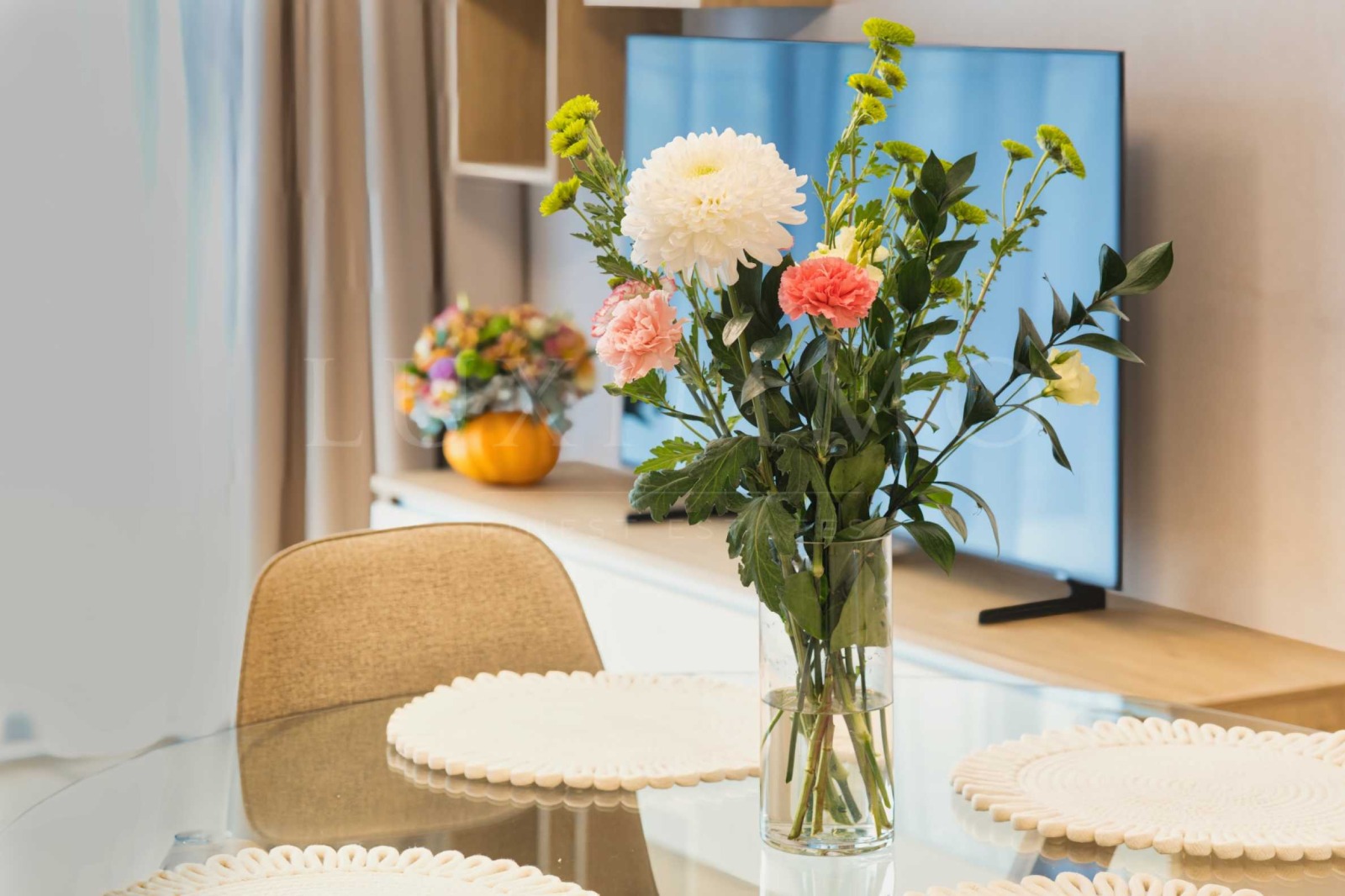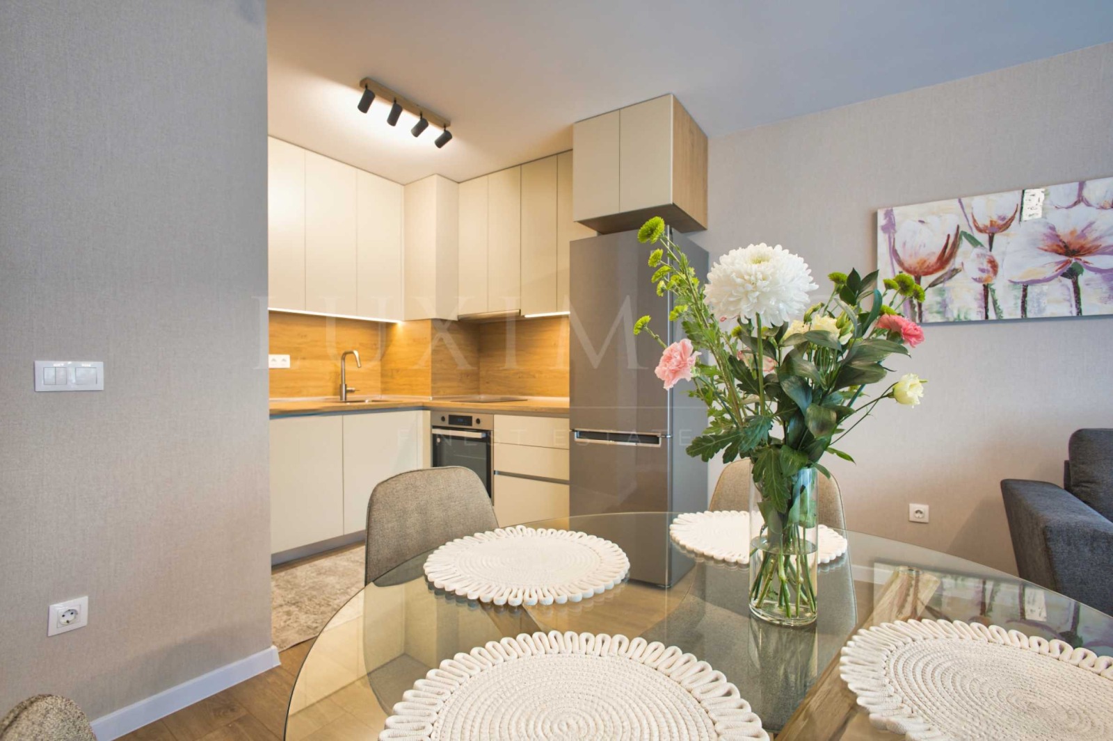 Всекидневна с кухненски бокс стилно обзаведена с диван, трапезна маса и телевизор, а кухнята е снабдена с висококачествени уреди: хладилник, фурна, керамични котлони, абсорбатор и т.н;