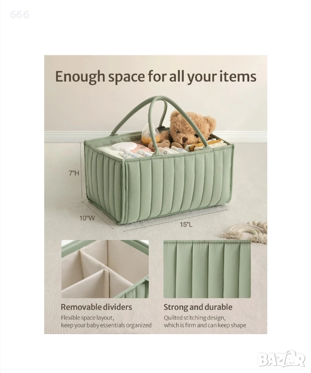 Кутия за пелени с дръжки и подвижни разделители - Дръжките улесняват пренасянето от стая в стая или където имате нужда от всички основни неща за бебето. В допълнение, той е оборудван с подвижни разделители, които ви позволяват свободно да регулирате вътрешното оформление, както е необходимо, за да отговори на нуждите за съхранение на различни предмети и да го поддържа чист и организиран.